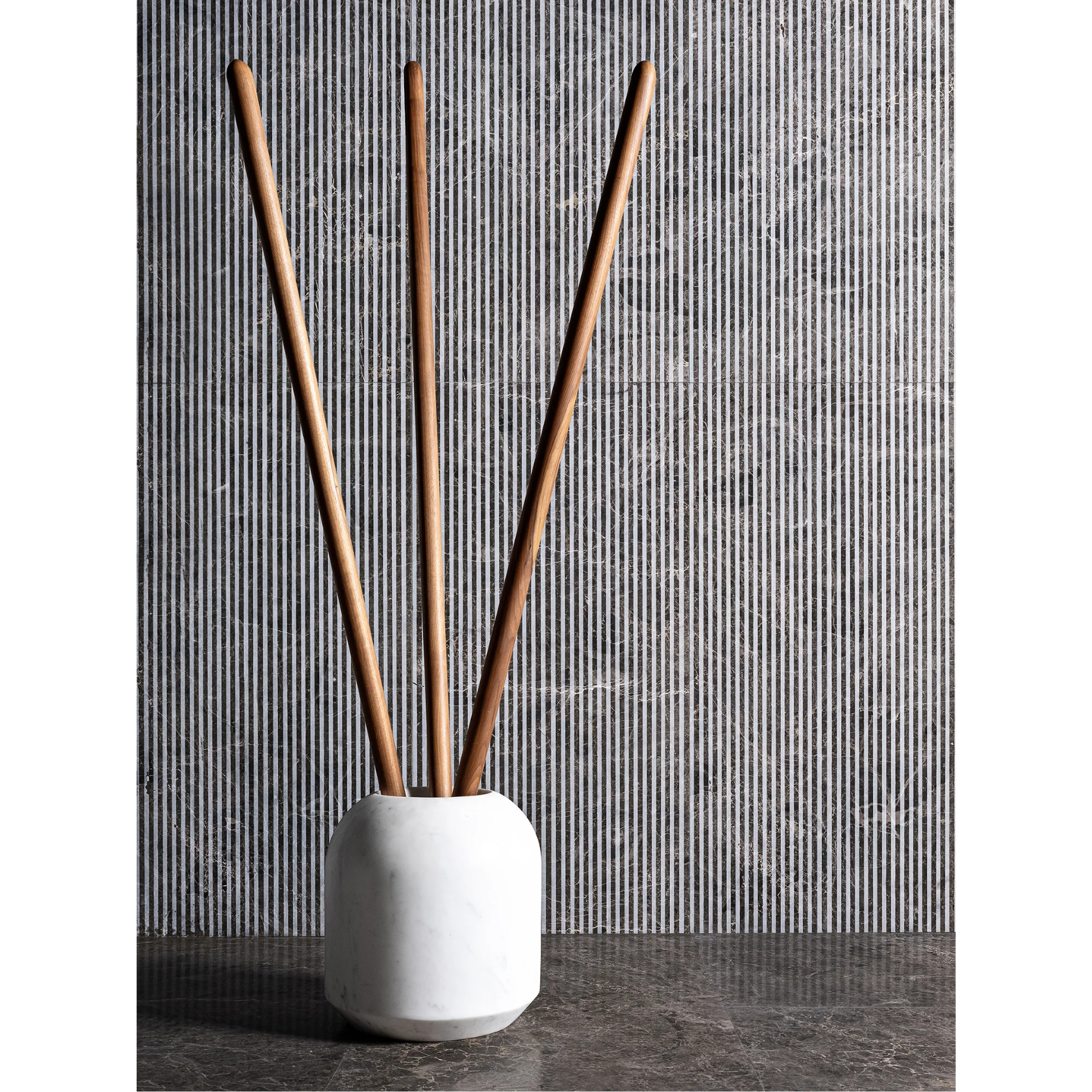 Part of the Territory collection, it uses sandblasting to create repeating lines of bicoloured marble. Lucinato is characterized by a series of parallel, honed and sandblasted lines that cross the slab. When applied on a wall, these areas of transitions generate the perception of textures, even though they feel completely flat to the touch. The versatility of this type of finishing means that, unlike other types of textures, it is not affected by the lighting solutions in the environment in which it is placed, thus making it universally applicable. These features have the power to attract the consumers, make them touch the surface and understand it. Meeting it reveals areas of soft, polished marble and rough, tactile surfaces that are perfect for bringing a touch of Brutalism to your living spaces.