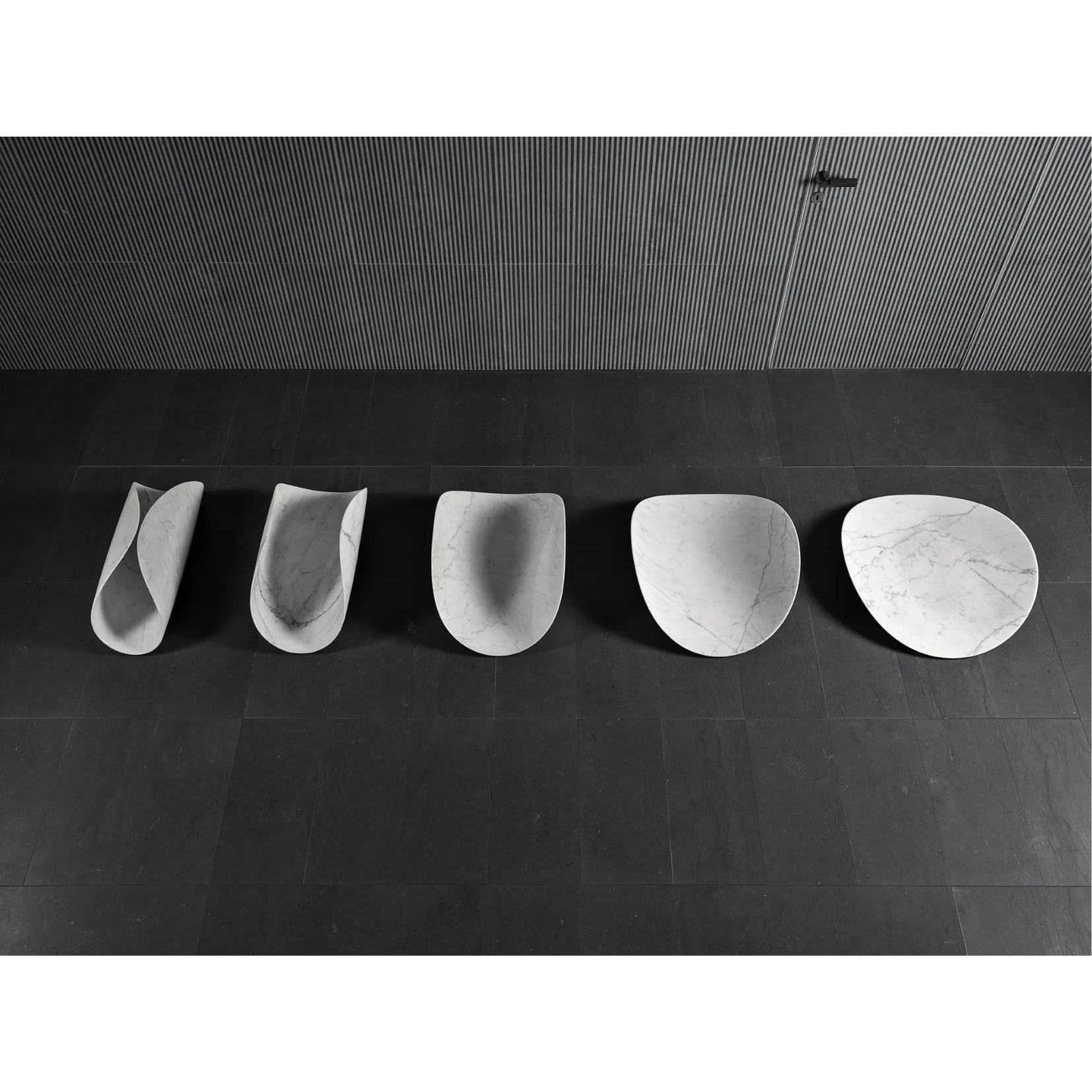 Manufactured thanks to state-of-the-art technologies of Luce Di Carrara, each piece is carved from a single solid block of marble to create these intricate and delicate forms. The name is inspired both by the 2010 book Miracle Crisps by Californian artist John Baldessari and by the DCW chairs made of molded plywood by Ray and Charles Eames, nicknamed Potato Chip chairs. Originally presented during a previous exhibition, the set is now part of the Luce Di Carrara offering and it perfectly reflects the design and artistic side of the brand. The design is also inspired by the ‘miracle fish,’ a red cellophane fortune-telling toy that curls and wriggles in response to the warmth and moisture of one’s hand, which is believed to reveal the specific moods, emotions and temperament of the person holding it.
