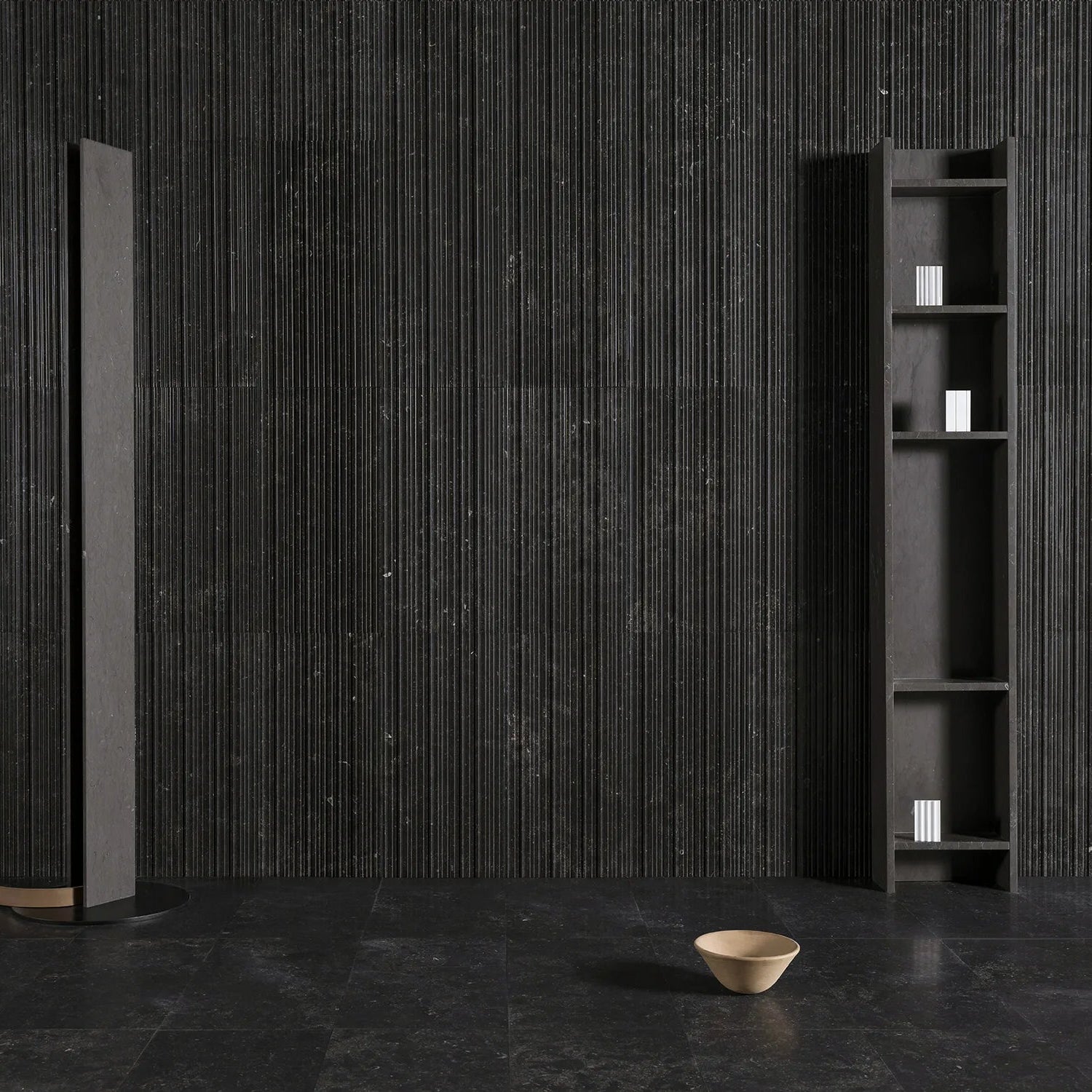 Because of the different thicknesses and cuts that a slab might need to receive, the machines need to be able to engrave the stone at different depths. It is exactly this variation that is the source of inspiration. The texture celebrates this phenomenon by creating parallel lines in the stone at many distances and depths. This process generates a rhythmic surface that is always in motion and in constant change. With the perfect lighting, the surfaces transform your walls into monoliths that celebrate the process of marble making. They create a covering solution in which the slabs that compose it flow seamlessly into one another, giving the impression that they are made from a single piece.