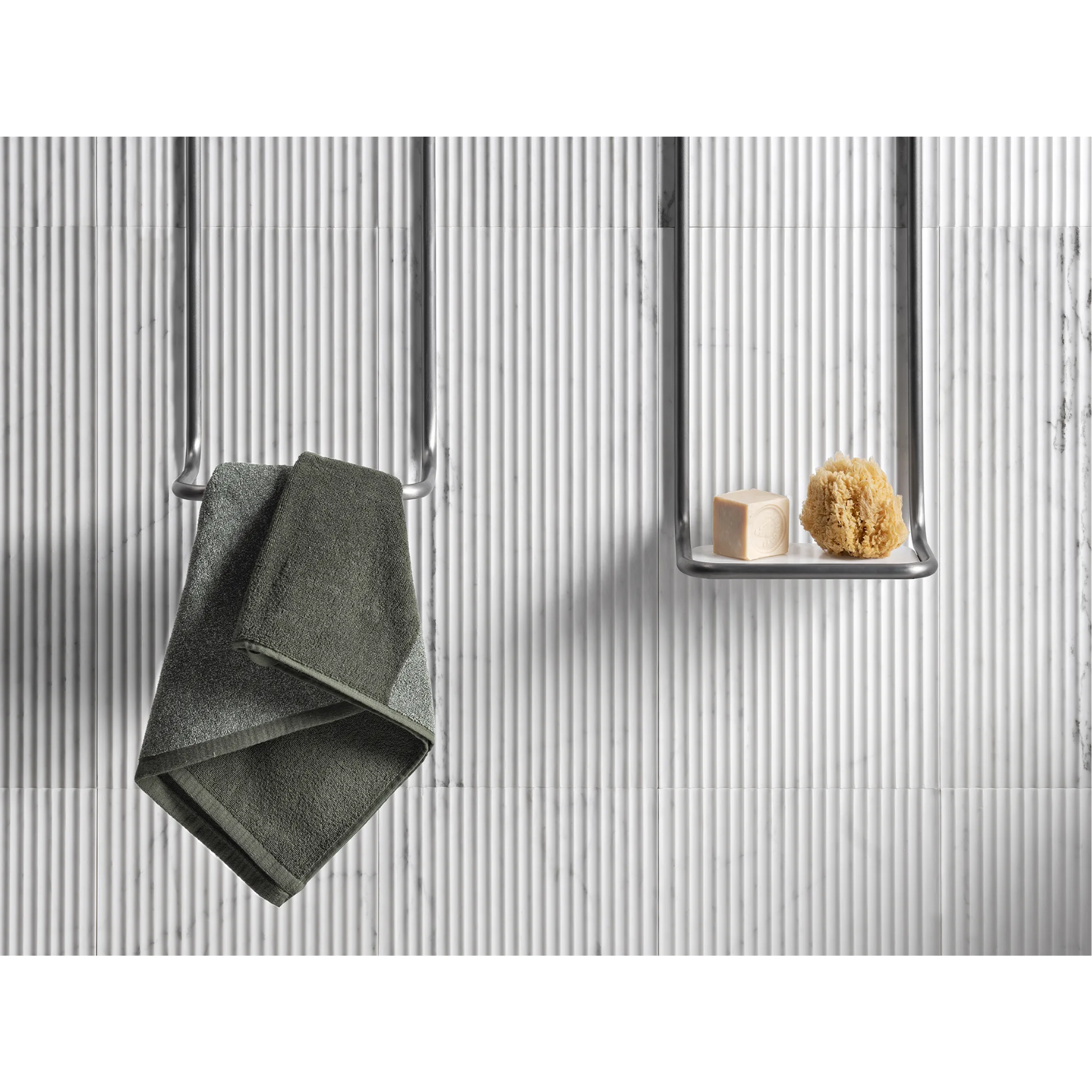 Luce di Carrara, in collaboration with the architecture studio Archea Associati, presents a line of bathroom accessories and decorations. From the extrusion of the letter ‘O’ in Oscar, the bathroom products designed to enrich any wall come to life. The combination of marble elements in different shades with continuous metal lines shows the extreme precision in the use and processing of the material – in which this company is a leader – thus enhancing the refinement of items. The strong link between marble and the languages of contemporary design and architecture emphasises the aesthetic dimension. The development of elementary geometries results in continuous tubular elements which extend over different vertical surfaces and always rotate with the same radius of curvature. The tubular brass structure – with a regular diameter of 16 mm – is deformed to suit its intended function through an expert construction technique. Three metal finishes (black nickel, burnished brass and copper) can be matched with as many types of marble, responding with elegance and versatility to any type of surface and requirement and thus becoming a coat stand, a towel rail, a mirror, a lighting element or a simple décor.