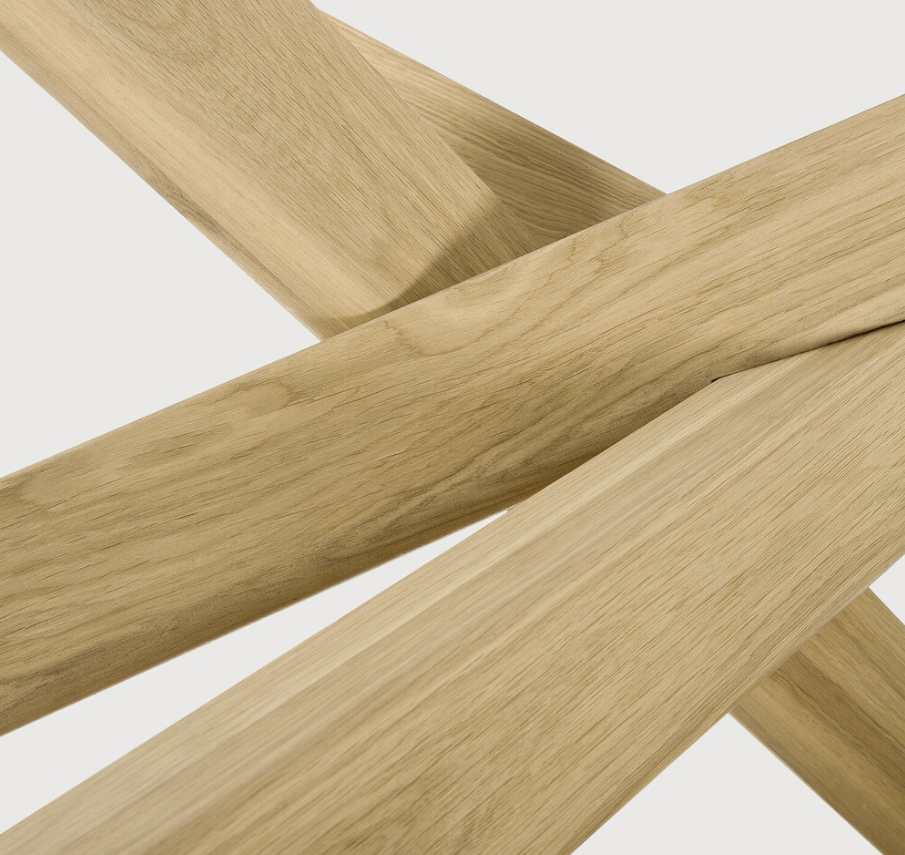 The Mikado dining table, designed by Alain van Havre, has been one of our most recognizable designs for years. For its round version, we kept the same eye-catching construction but aimed for a visually lighter design. In an exercise of balance and stability, the legs are thinner and more refined with round edges to fit the solid oak dining table's new shape.