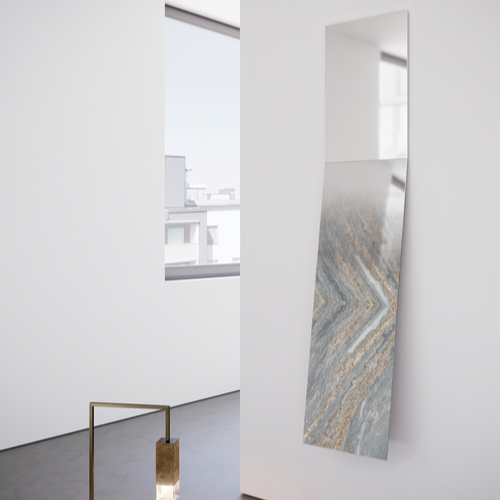 The sophisticated and sought-after nuances of Palissandro Blu Nuvolato marble, here result of careful handcraft through its extra-thinness of less than 3 mm, are juxtaposed to hand-ground crystal slab, featuring a mirror gradient. This innovative manufacturing technique provides the unforeseen trompe-l’oeil effect of a solid marble surface almost fading into the wall, indissolubly blending the objective and subjective dimensions through thin and lightweight materials layering. Together with a frameless and sleek appearance, a faint tilt provides a further twist in the subject perception, increasing the engagement and highlighting the unexpected two-dimensional materiality of this décor mirror composition.