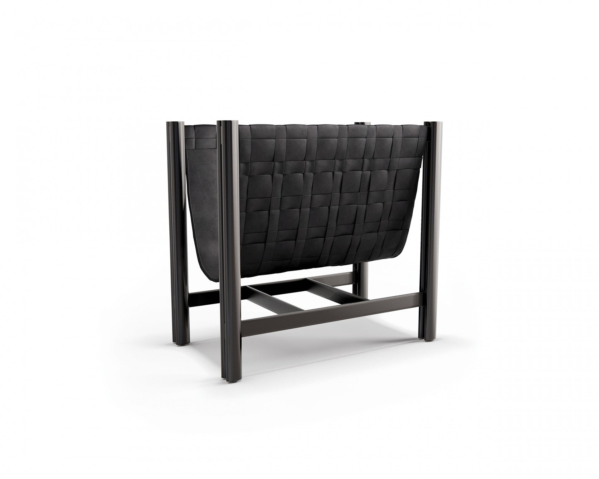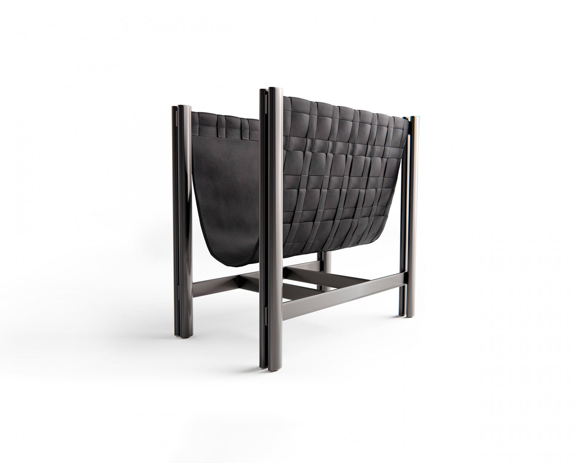 The Denver magazine rack embodies functionality with elegance. A practical and refined element, ideal for maintaining order and organization in the living space. The tubular structure in glossy painted metal is enriched by the manual craftsmanship of leather weaving, which serves as a support for magazines.