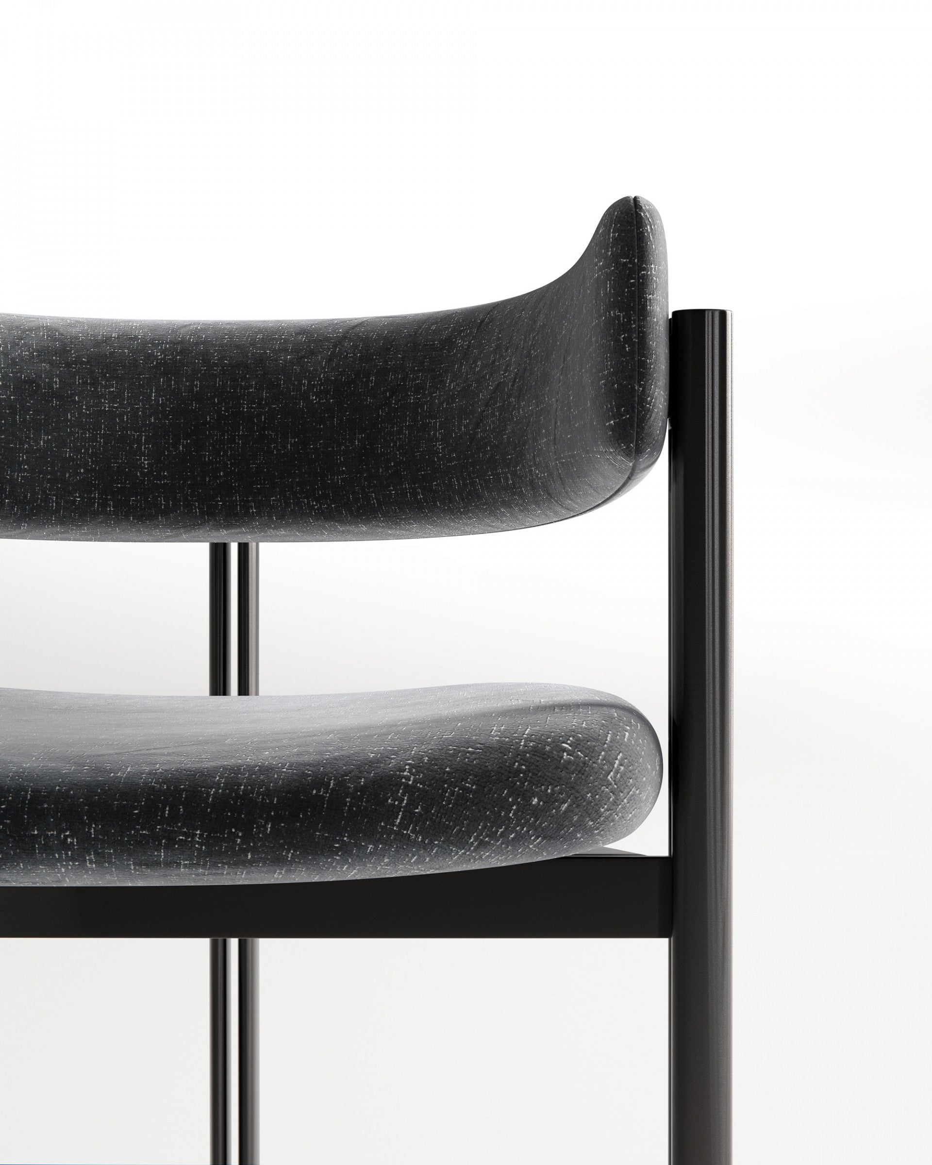 The Monterrey chair is characterized by a tubular structure with an elliptical section in metal painted in a glossy or matt metal finish. The backrest is made of cold-foam with a polyurethane coating, while the seat is entirely in polyurethane. The upholstery is available in fabric, eco-leather, and leather, and it is non-removable.