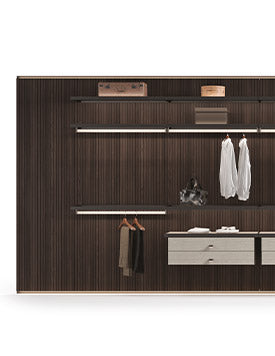 The complete integration of the supporting structure with the Palo Alto Free and Palo Alto I-Box walk-in closet systems opens up an infinite range of furnishing possibilities and allows you to create a bewitching dialogue between materials of unparalleled quality. Glass and wood, transparency and matter, alternate in an irresistible play of light and textures, offering an exceptional setting for your objects of desire. The prestige of the materials can be further enhanced by installing exclusive LED lights, thanks to the electrified rack structure.