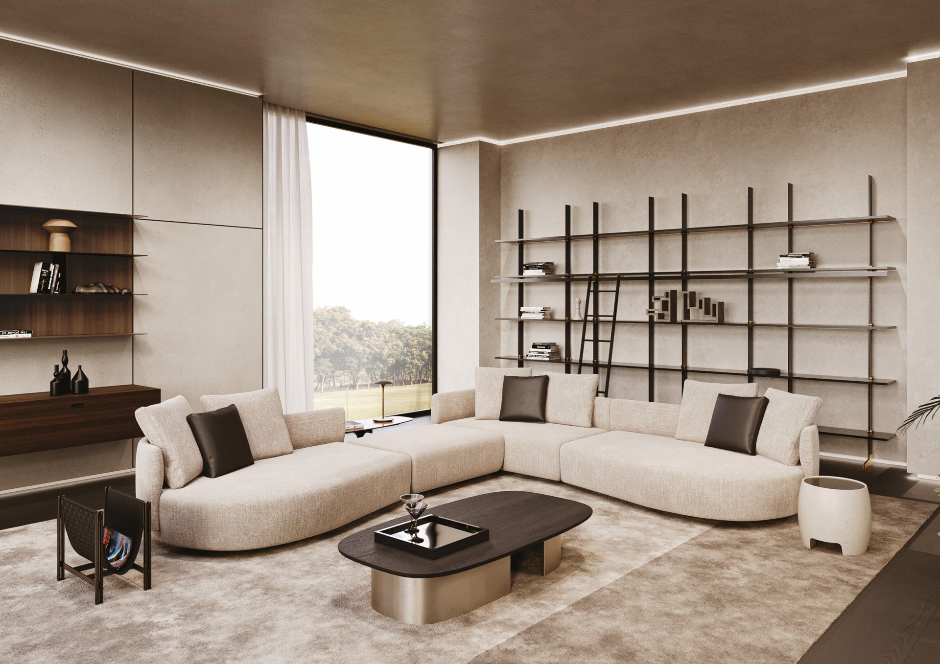 Modular sofa system characterized by multiple composition possibilities, consisting of 11 base elements that can be combined to create linear and corner configurations. The structure is made of wood and plywood covered with a layer of molded flexible polyurethane, equipped with h. 40 mm PVC feet. The seat cushion is made of shaped polyurethane foam with differentiated densities, covered in polyester fiber, while the backrest is made of polyester fiber with a cotton lining. The final upholstery is available in fabric, eco-leather, or leather; all upholstery types are removable. A bicolor variant is available, featuring different finishes for the backrest and seat upholstery. The coffee table is independent from the sofas and can be placed freely. Its structure is made of varnished Gunmetal, with a top available in matt wood veneer, all finishes.