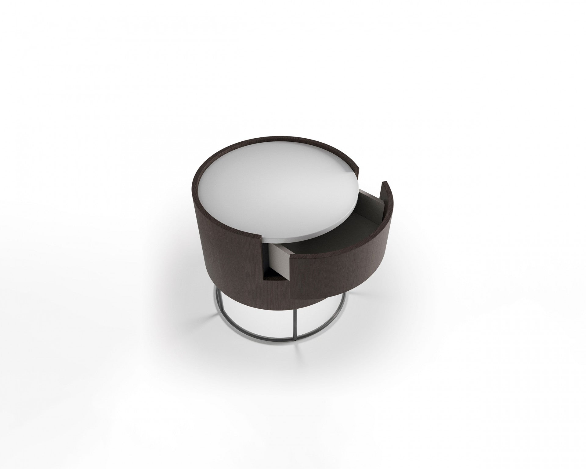 Shanghai is a bedside unit with discrete dimensions, a geometrically pure island for the night area. With slender structured legs as if to suspend the volume. Base in gun metal finish. Structure container in tubular covered in oak. A light is available to position underneath the top of the bedside unit.