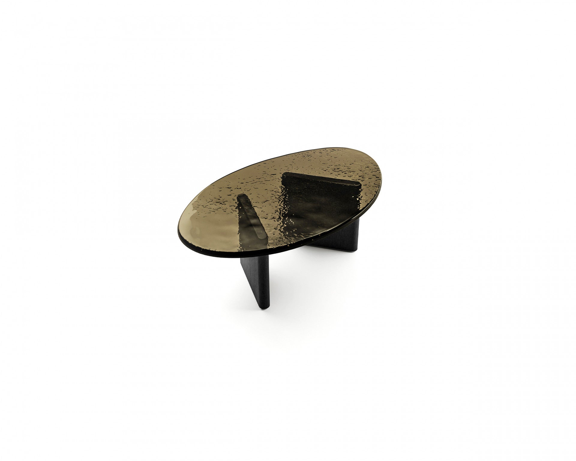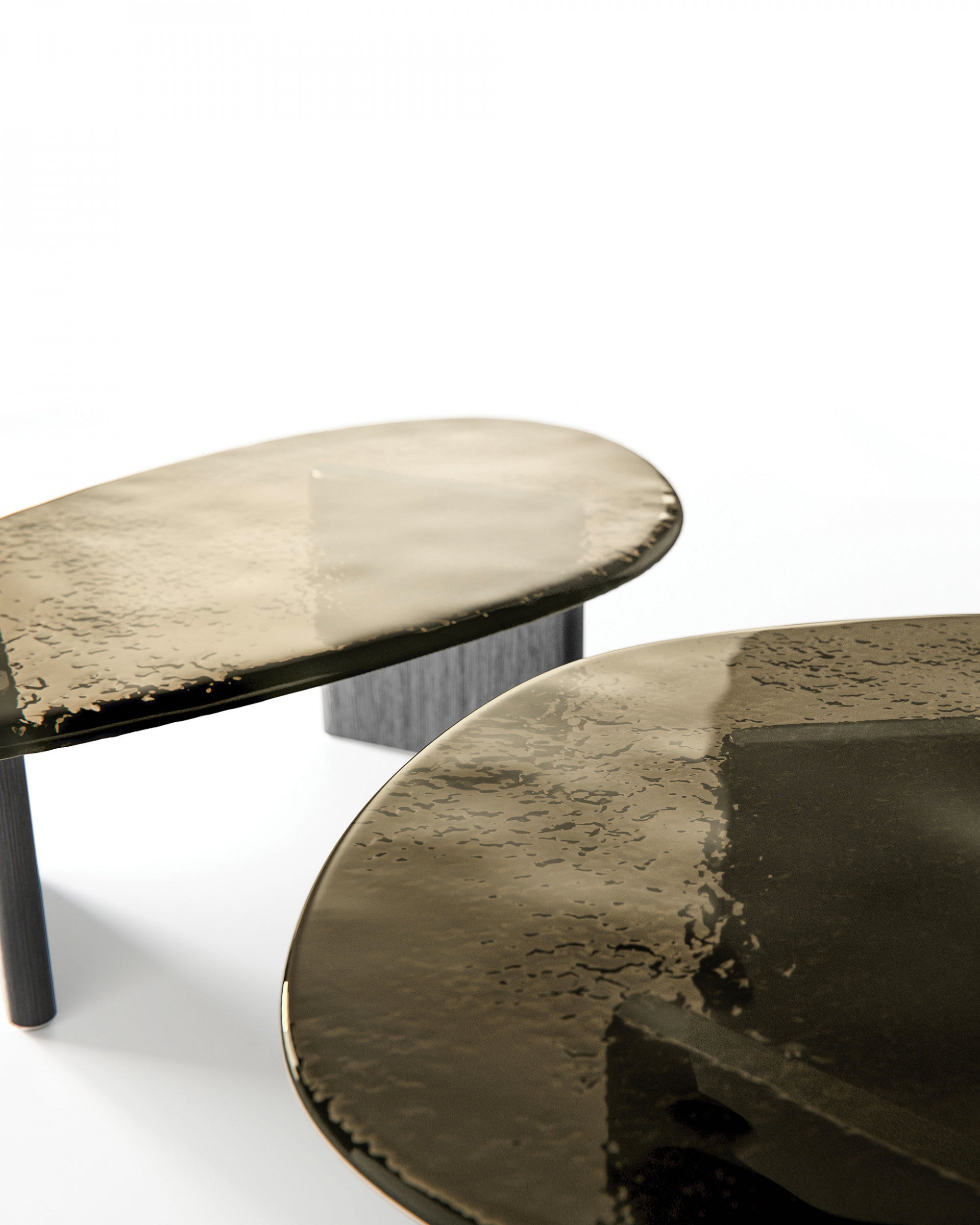 A series of tables with irregular semioval shapes distinguished by the bronze casted glass top, positioned with the smooth part facing upwards, supported by the curved legs in Black Oak through stainless steel plates.