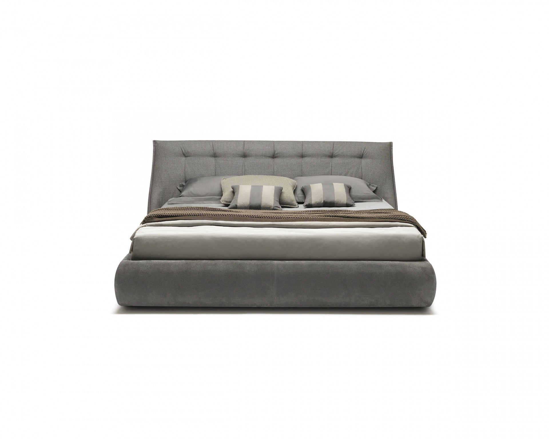 A particularly distinguished upholstered bed that exudes sophisticated elegance, while its generous shapes suggest a enveloping comfort. The headboard is made of class E1 wood particleboard, finished with decorative melamine facing. Covered with polyurethane foam and cover with coupled velveteen. The storage compartment is made of a panel of wood particles with E1 formaldehyde class, laminated with decorative papers impregnated with melamine resins. The model with a raisable bedspring has a storage bottom made of 14mm laminated board, which can be raised using a handle. It is compatible with mattresses measuring 1600 / 1800 mm. The raisable bedspring operates with two movements and has a wooden frame and slats, designed to store items in the compartment. The base can be released and positioned horizontally for making the bed. Lifting pistons 1150 NW. Note: The pistons of the lifting mechanism are designed to raise the bed base with the mattress weighing a maximum of 35 kg (for both the 1600x2000 and 1800x2000 bases). The fixed bedspring has a wooden frame and slats resting on metal crossbars. The bed with manual and electric movement bedspring is equipped with painted metal crossbars for base support. Both options are compatible with mattresses measuring 1530 / 1600 / 1800 / 1930 mm. The upholstered bed frame and headboard can be covered in fabric, eco-leather, and leather. Only the bed frame is removable. The front part of the headboard can be covered in fabric or leather in a finish different from the bed frame and the back of the headboard.