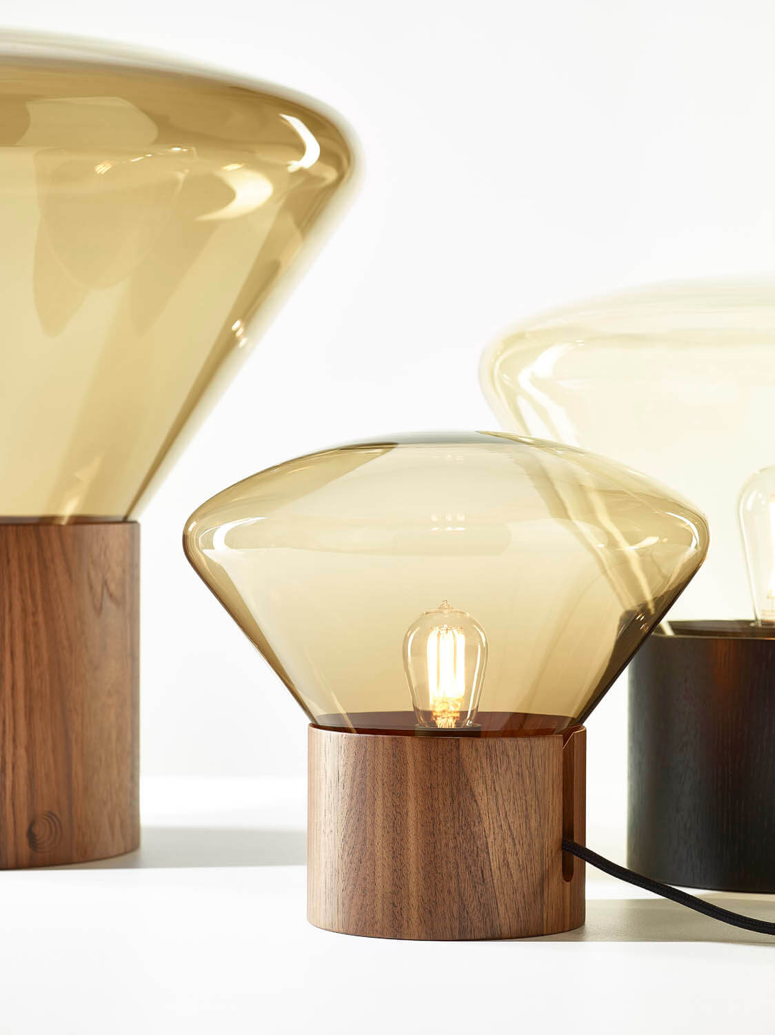 The Muffins Table Lamp features a billowing glass shade set in a handcrafted wood base. Pair with a vintage-style filament bulb and Muffins will breathe light into any space and create a festive ambiance. Available with a variety of glass and wood combinations in three sizes.