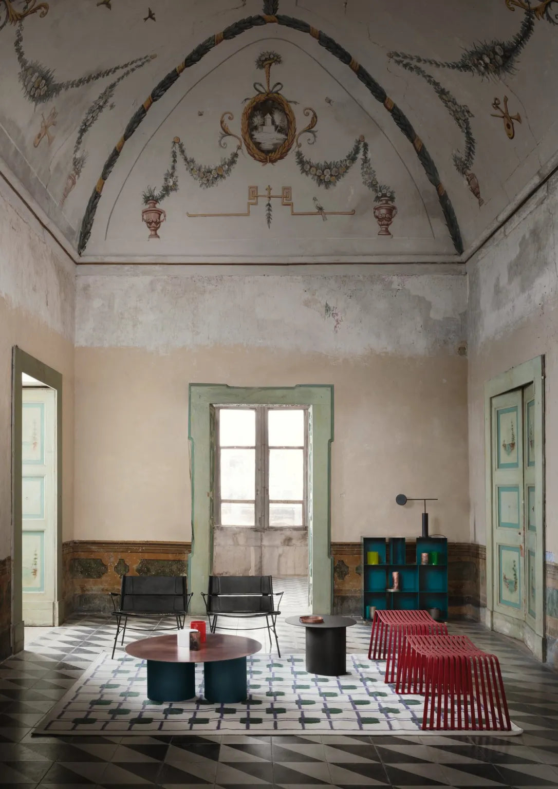 Indoor pouf, realized with round steel tube frame and two strips of full-grain hide leather with visible stitching, fixed by technical belts