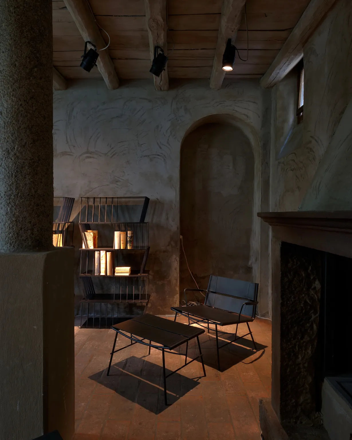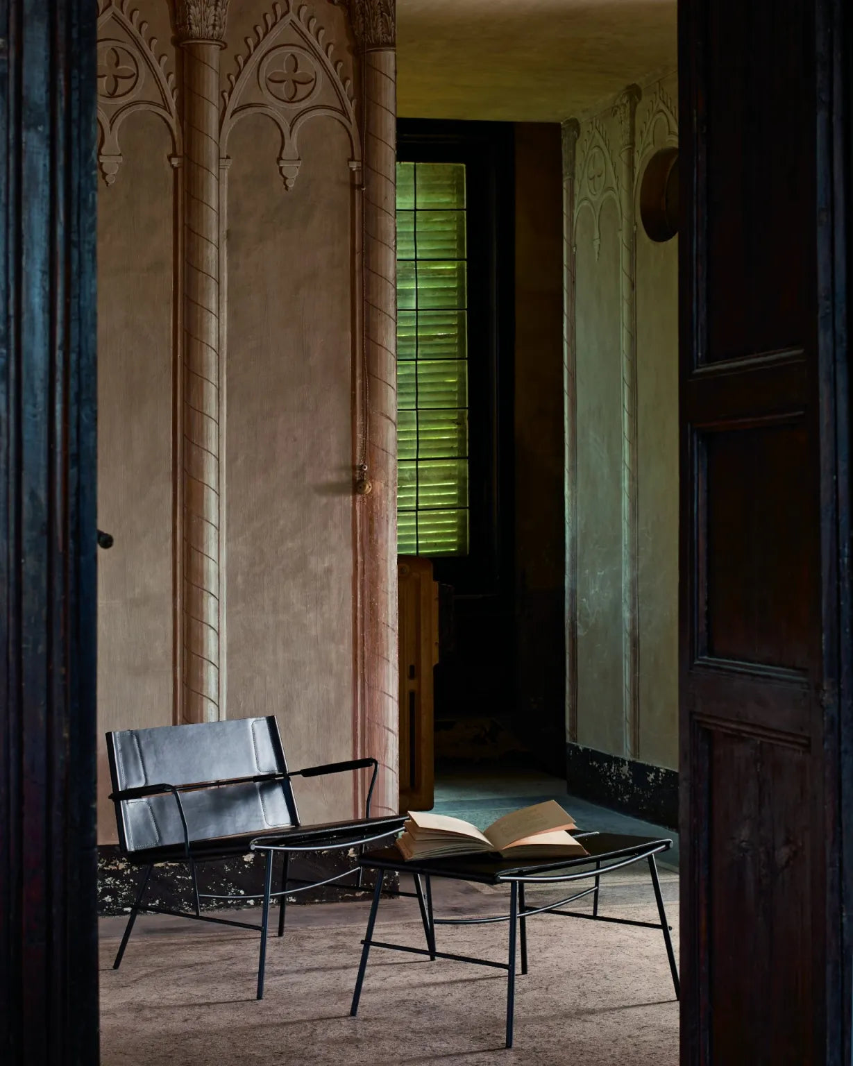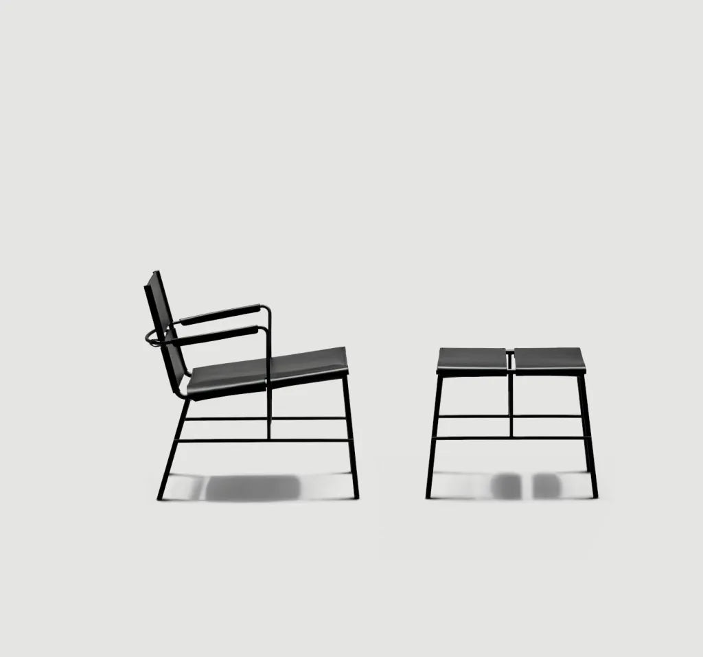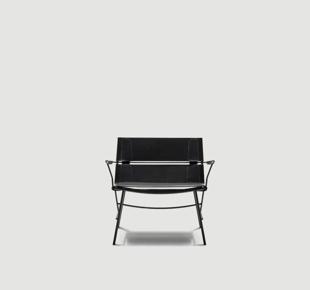 Indoor lounge chair, frame in round steel tube. Seat in upholstered full-grain hide leather with visible stitching fixed by technical belts, backrest in two full-grain hide leather strips with visible stitching, armrest partially upholstered in full-grain hide leather with visible stitching