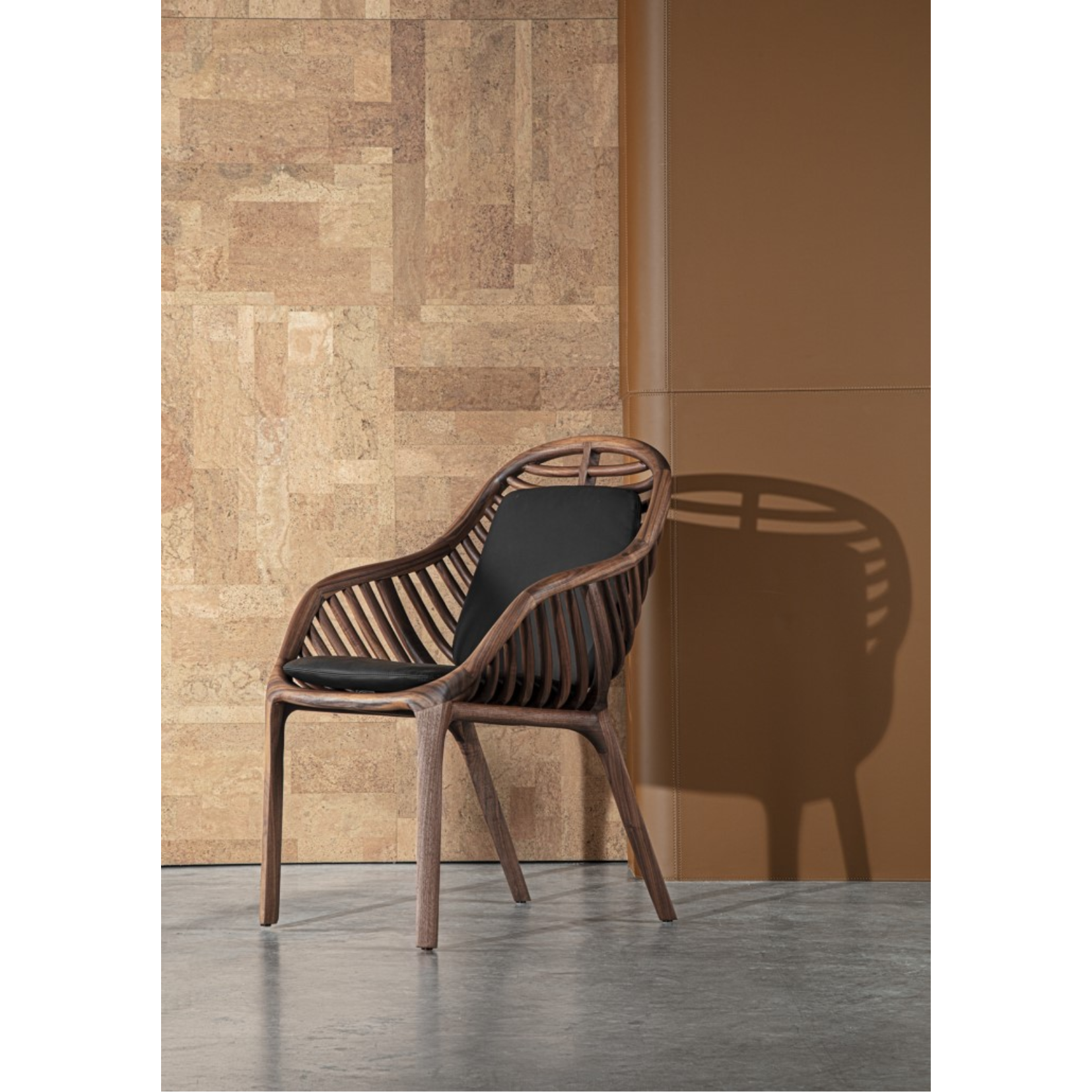 Chair expertly turned by our master cabinetmakers: a true masterpiece. Entirely hand-made. Where has our inspiration come from? From nature and the observation of the palm leaves, from which it takes shape and defines its back and session. Pam is an ambitious product that aims to become a desire object, protagonist of luxury interiors which will leave you breathless.