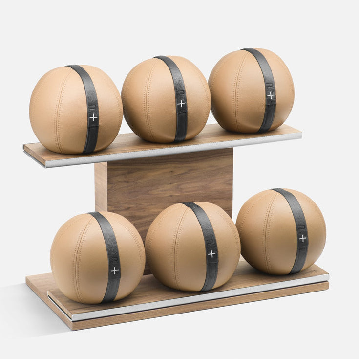 Complementing the weighted ball set is a handcrafted horizontal stand made from natural wood, steel, and genuine Italian leather. This stand not only adds to the aesthetics of your fitness area but also ensures easy access and storage for your MOXA™ weighted balls.