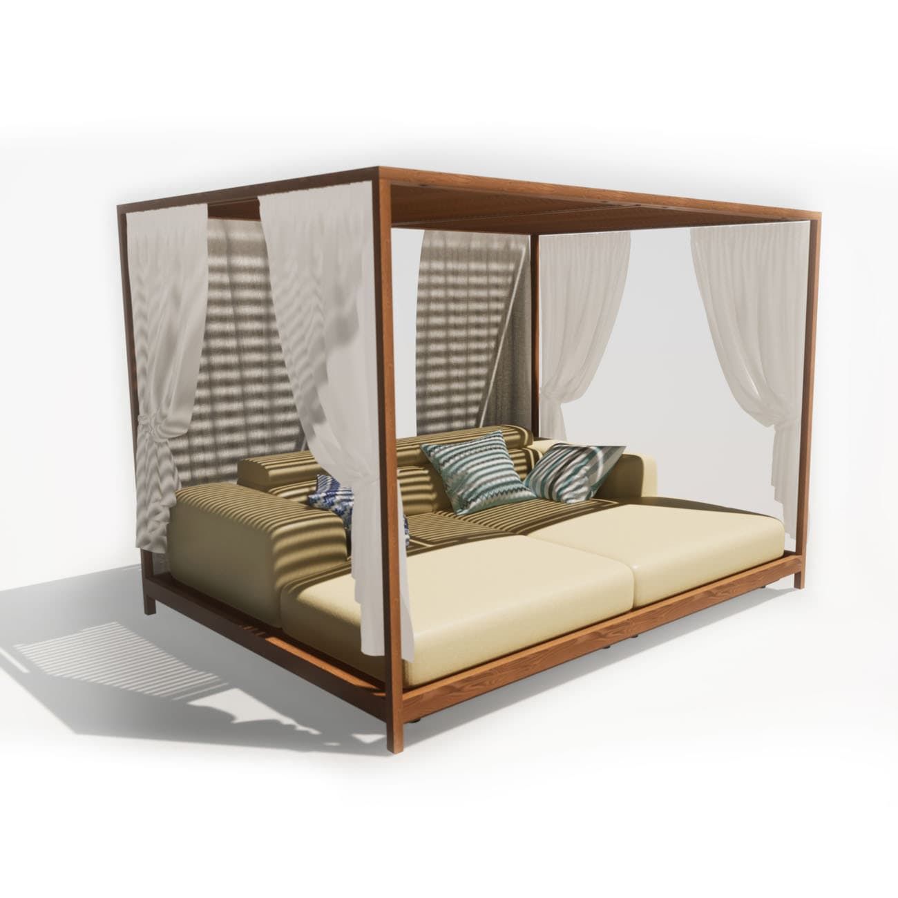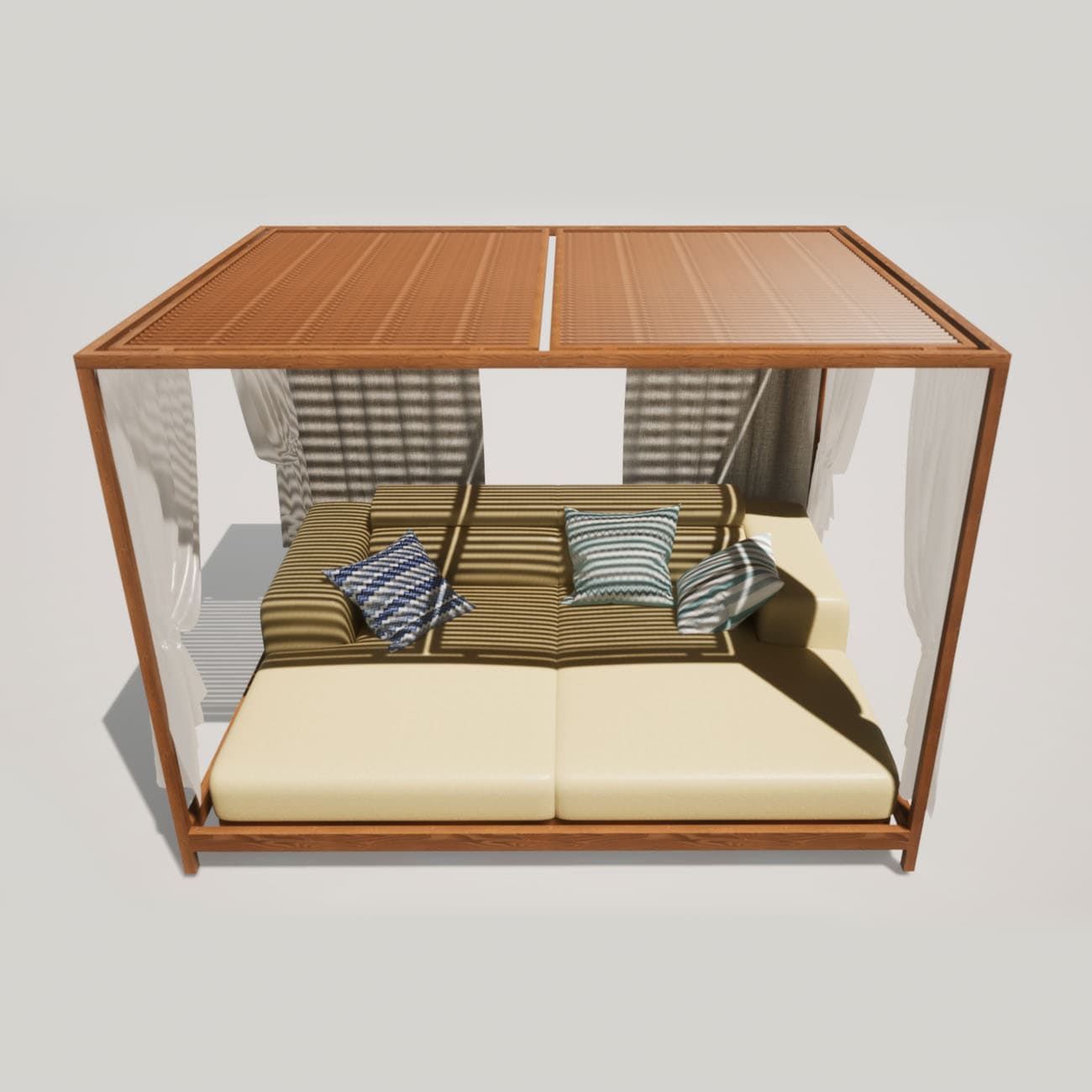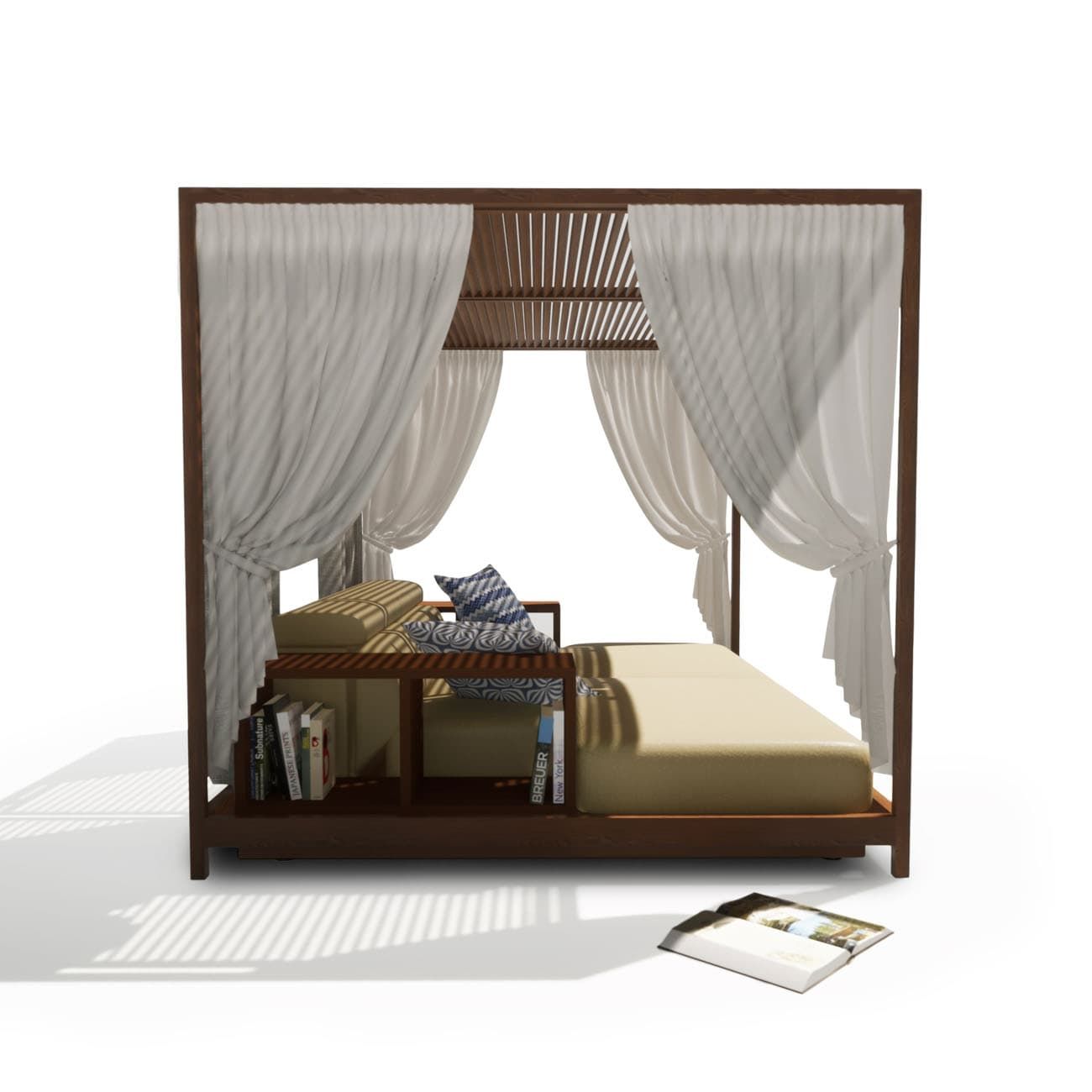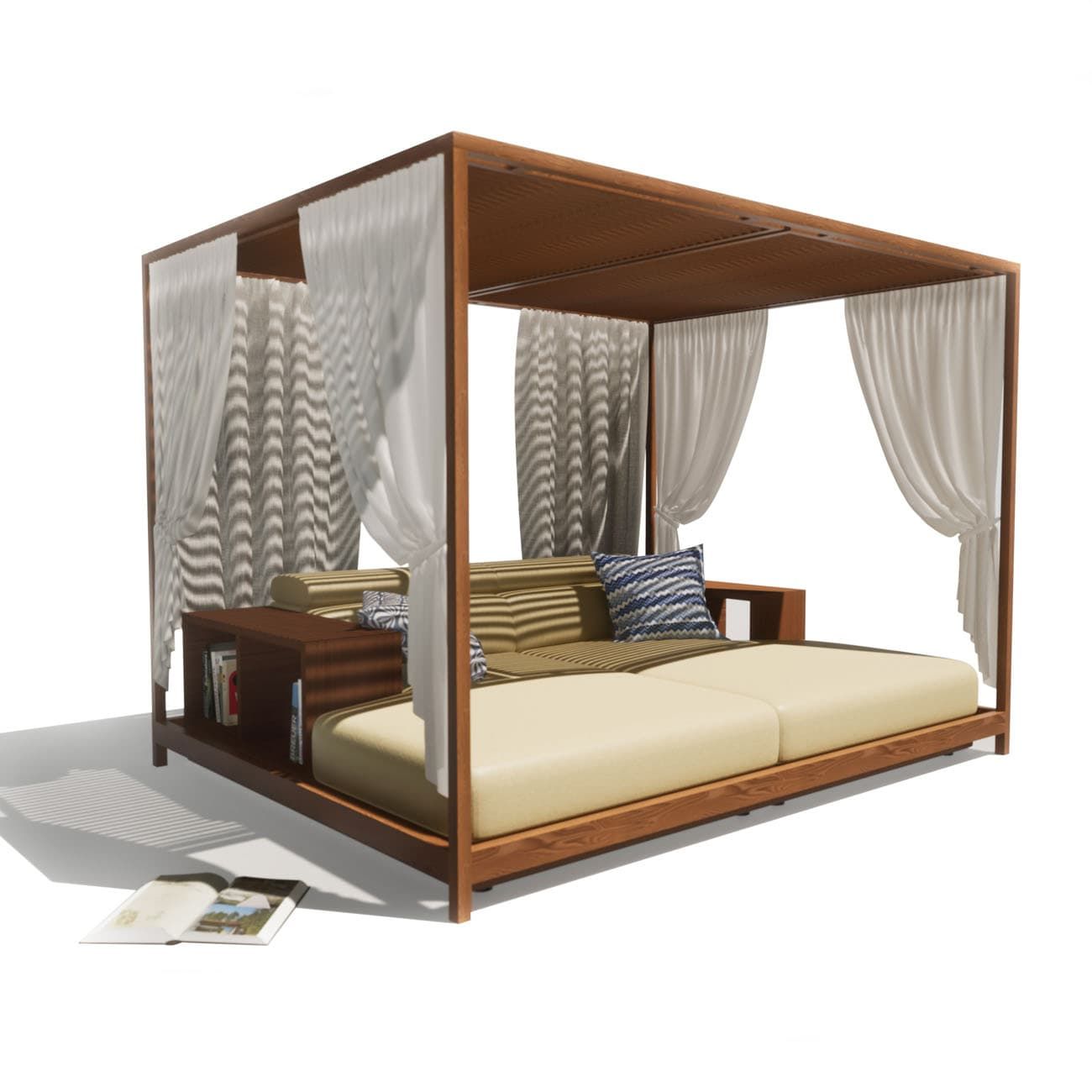 All in fabric BoucléOutdoor col. 401, structure & bookshelf in Iroko solid wood with outdoor white curtains.