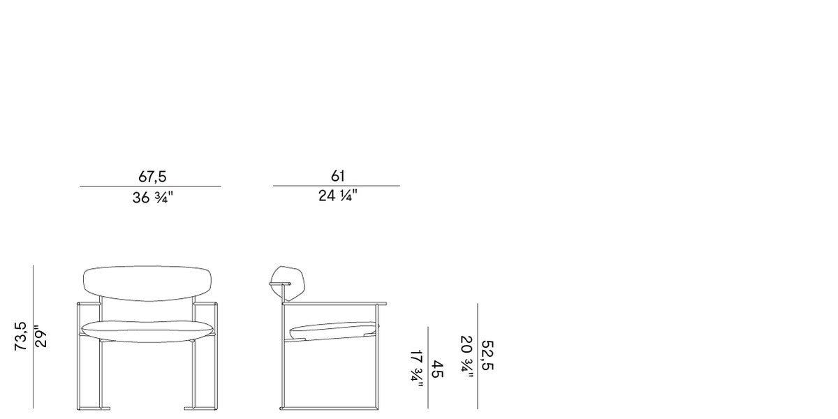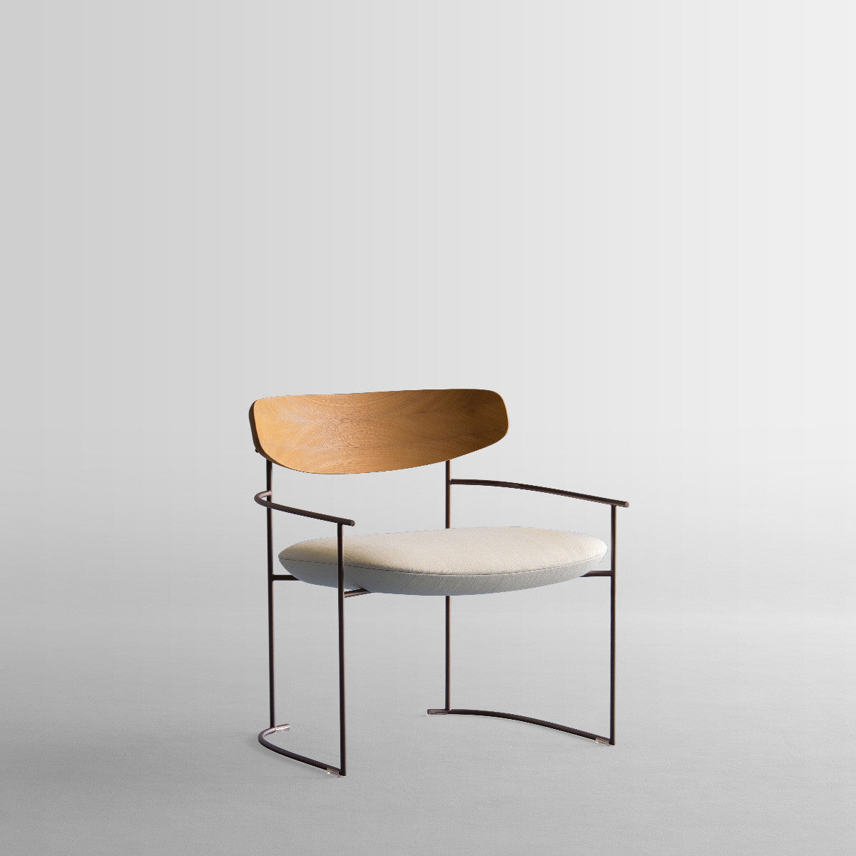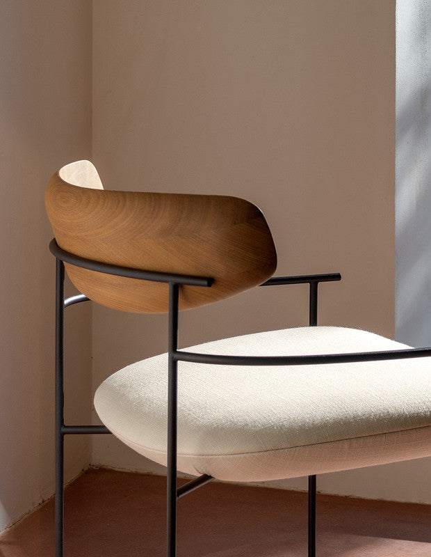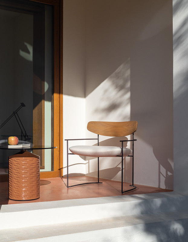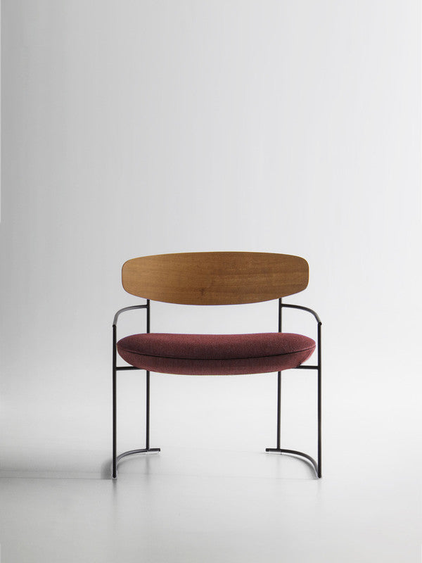 The Keel armchair, part of the homonymous collection consisting of a chair, small armchair and stools, is the result of the research into the relationship between geometric rigor and organic sinuosity.