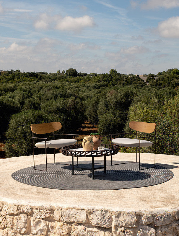 This armchair features a linear structure in metal rod and support elements in solid Iroko wood.