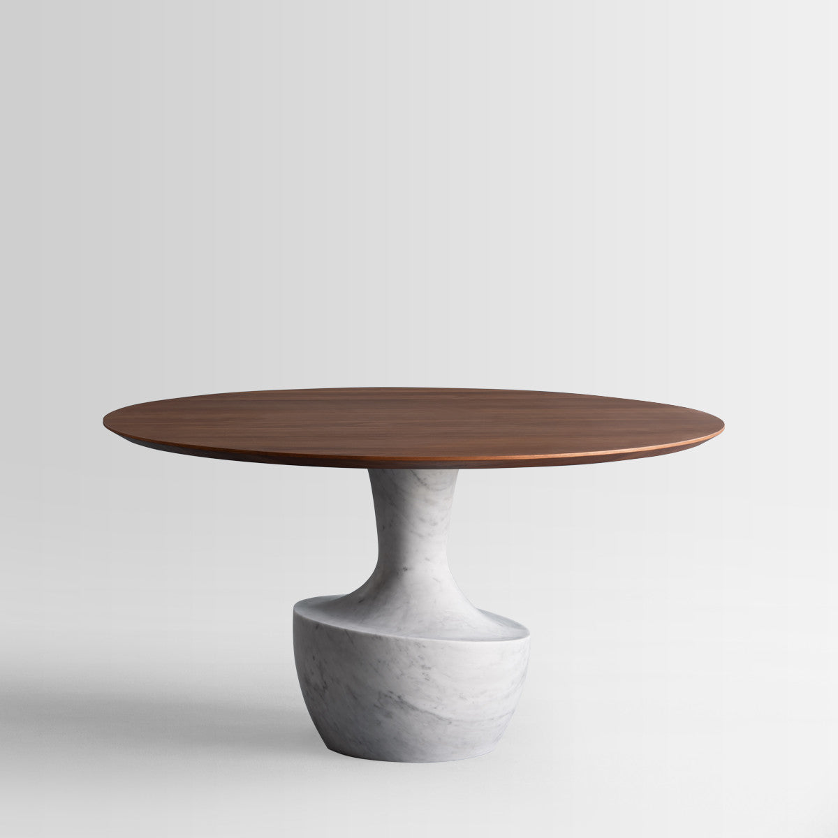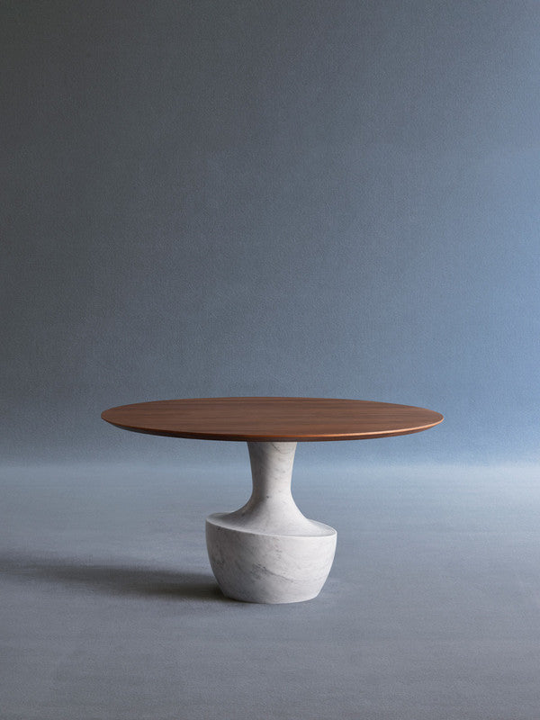 Anfora is a round table in two sizes, with a matt whote carrara marble base , combined with a thin bronzed tempered glass or Canaletto walnut top.