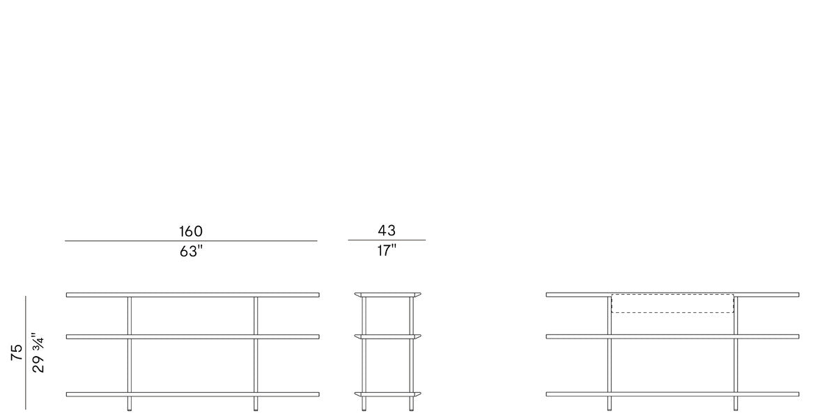 Ideal endorsed on walls, as well as in the center of the room, for a delicate and elegant partition of the ambiences, the Arial lower bookcase consists of shelves in ash wood or Canaletto walnut, with alternating pitches, with a tapering at the edges that accentuates its aerial character.