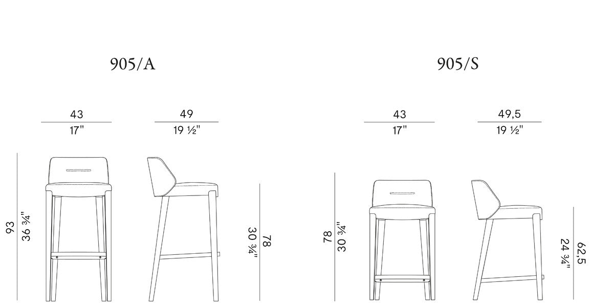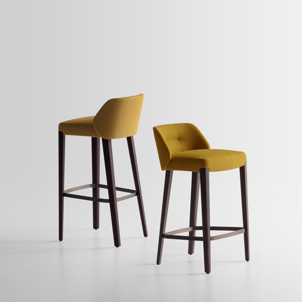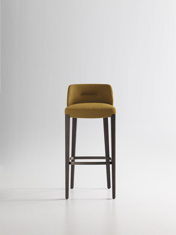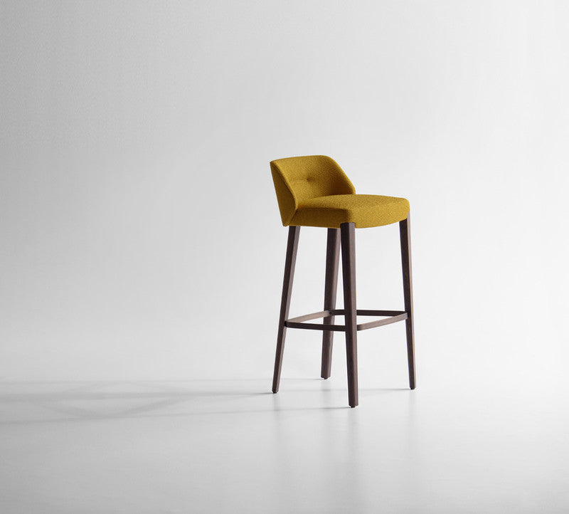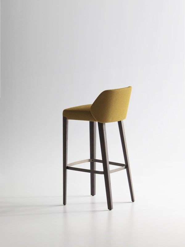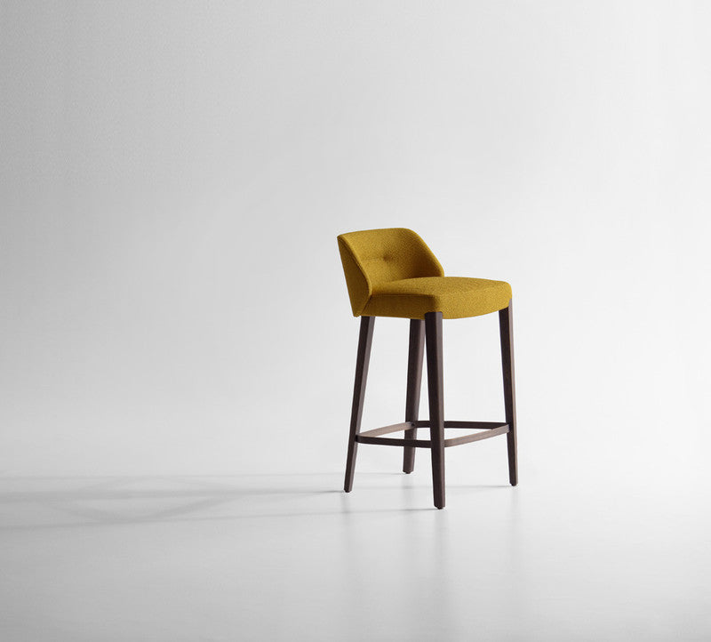 Stool in two heights, part of the homonymous collection made of chair and armchair, with seat and backrest padded in fire retardant polyurethane foam.