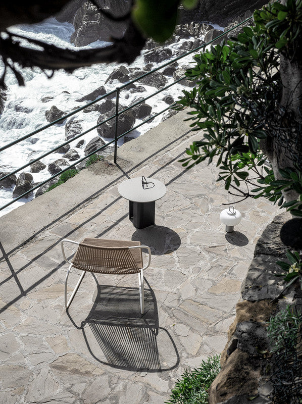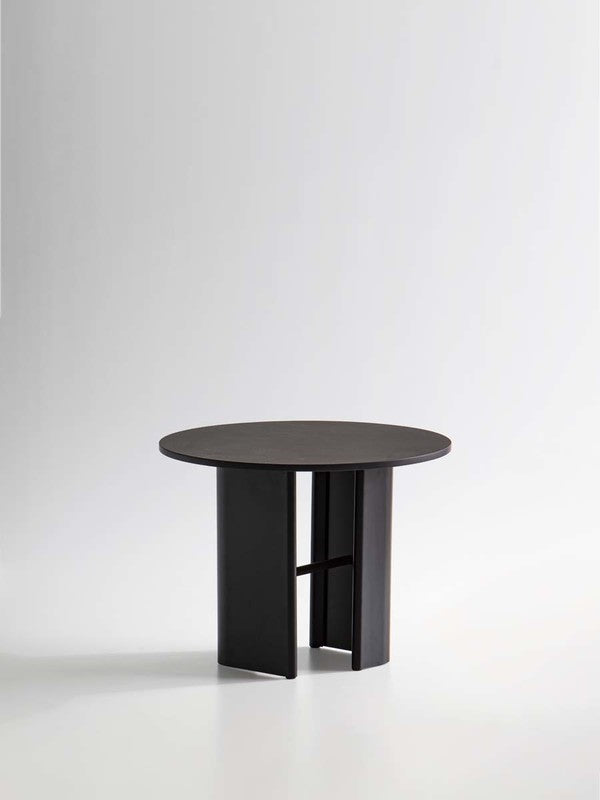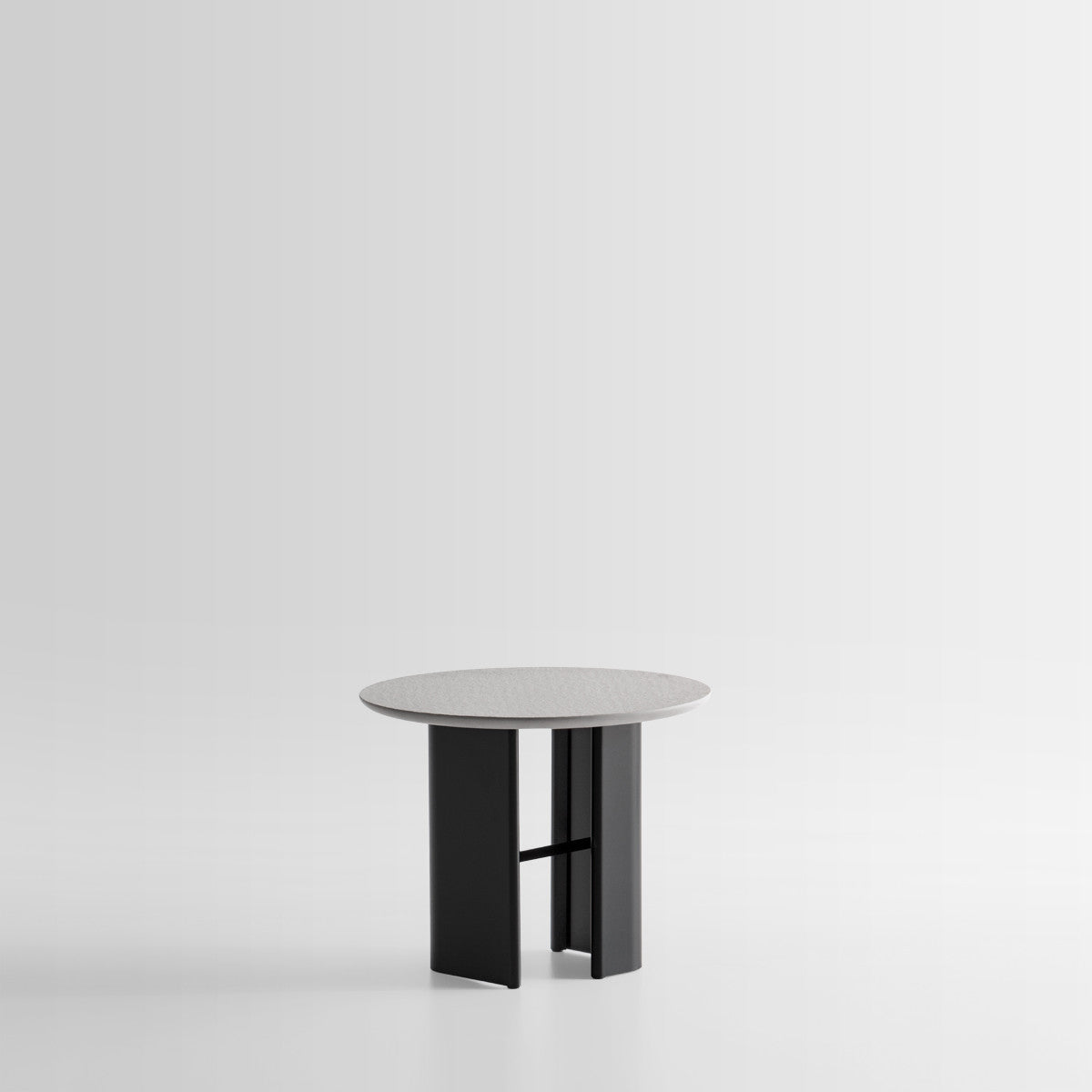 Coffee table with circular top and base in epoxy powder coated steel sheet with black embossed finish.