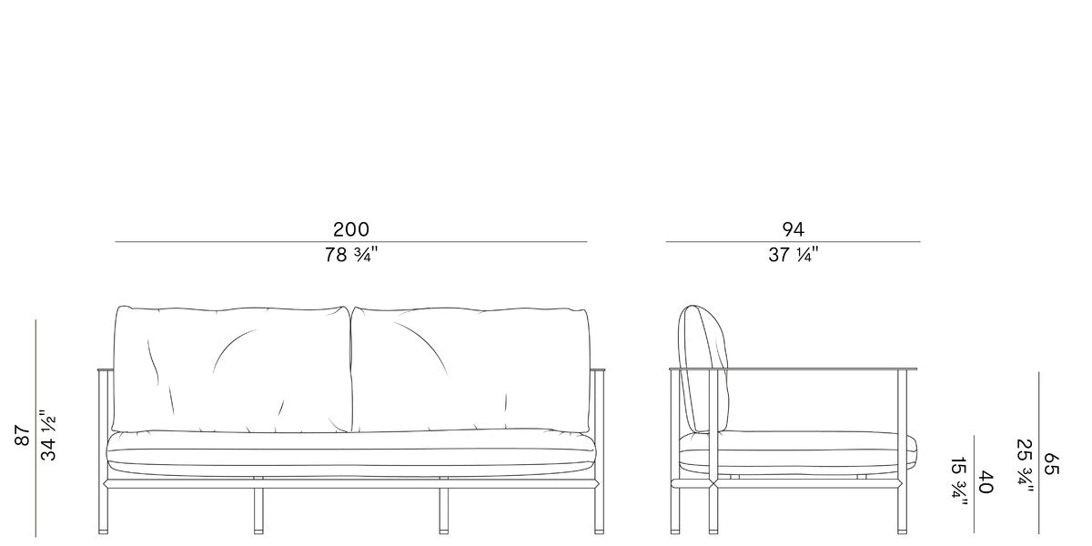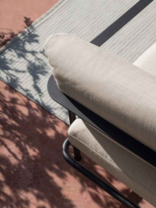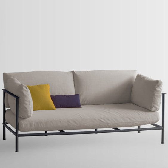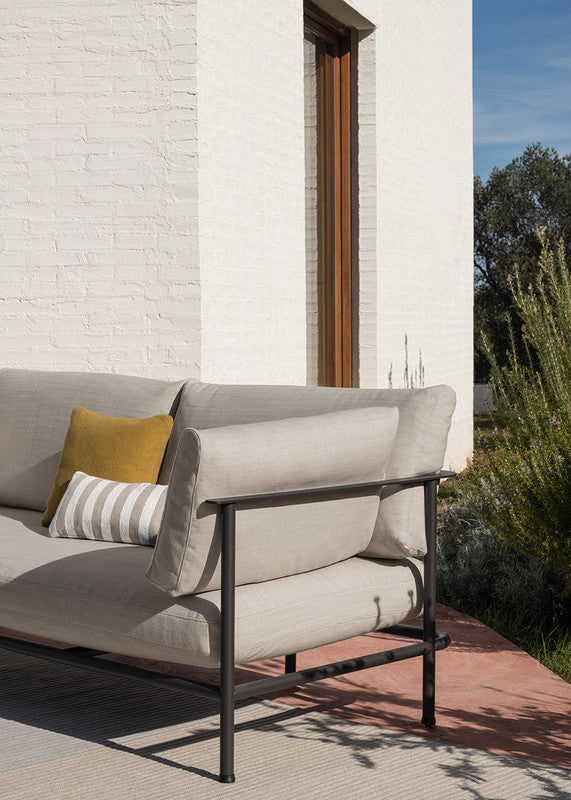 The Elodie sofa is characterized by an essential exposed structure, in embossed anthracite or Aval metal tube, designed to accommodate the large cushions, padded in fire retardant polyurethane foam, that rest on a flat metal profile that runs all around the cushions supporting it.