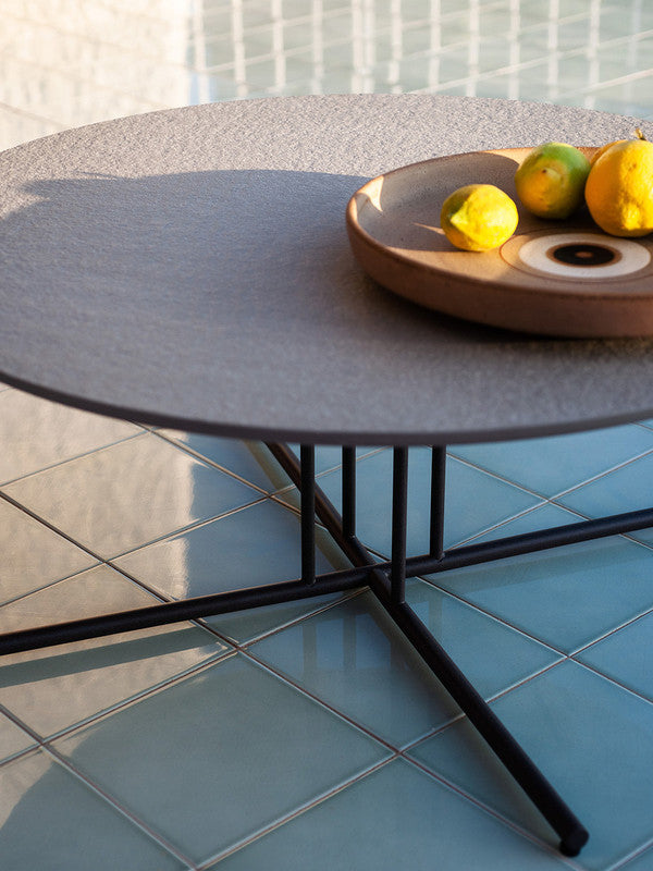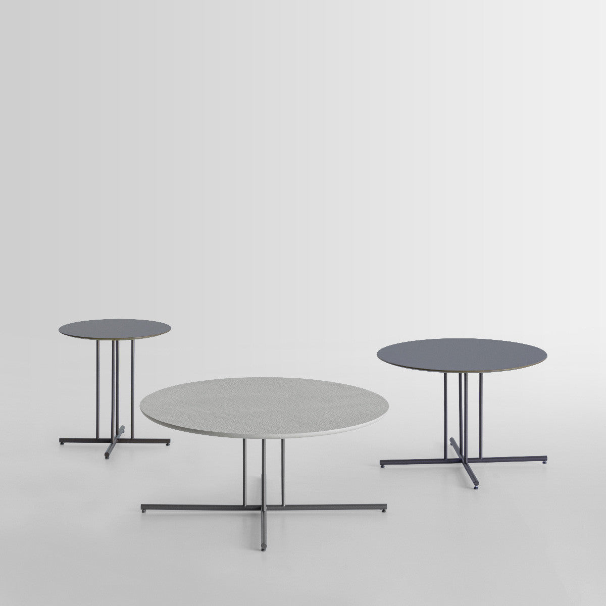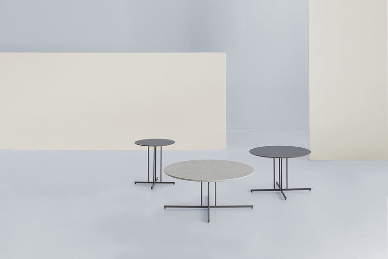 The structure, composed of thin and geometrical elements, is harmoniously combined with functional surfaces, creating tables, the bench, the writing desk and complementary coffee tables.