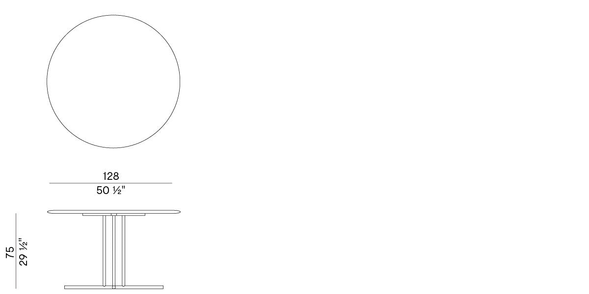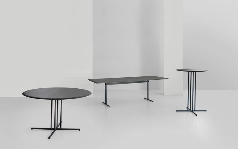 The structure, composed of thin and geometrical elements, is harmoniously combined with functional surfaces, creating tables, the bench, the writing desk and complementary coffee tables.