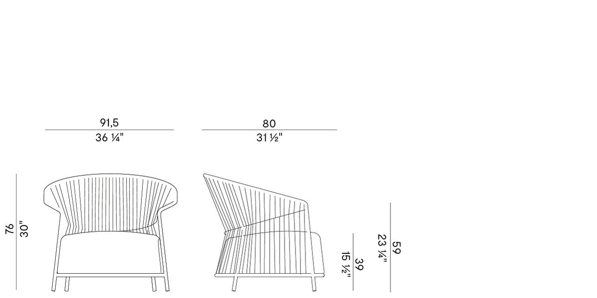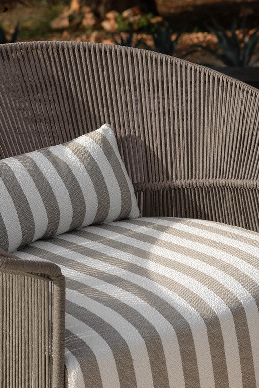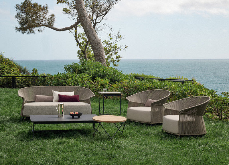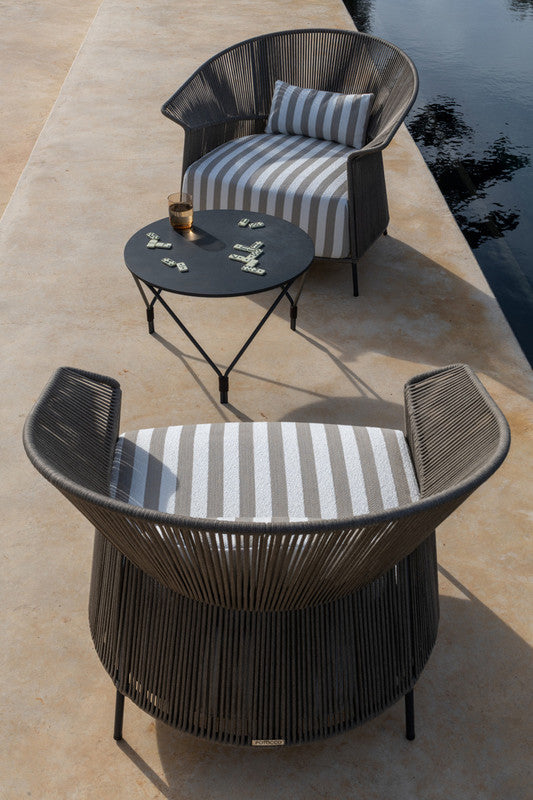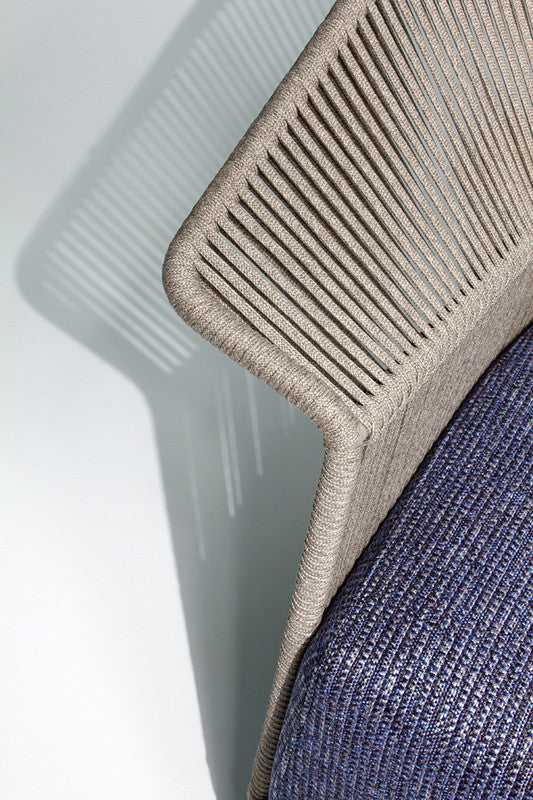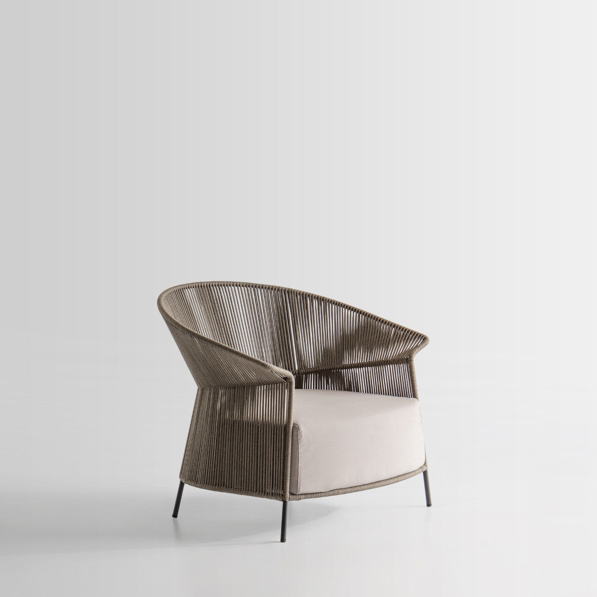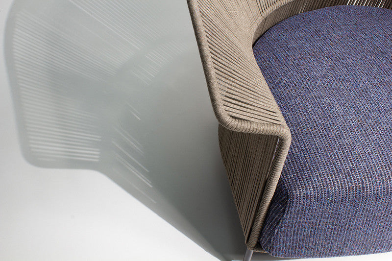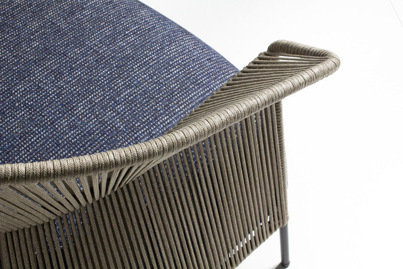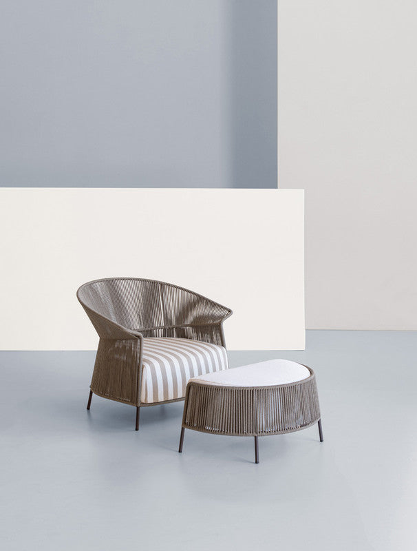 The armchair is characterized by a wrapping backrest, made of metal lacquered outdoor powder coated frame, hand woven in “Fly” ribbon.
