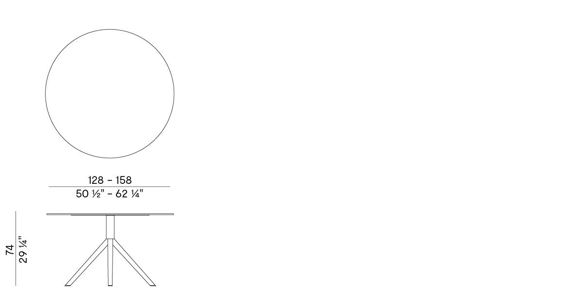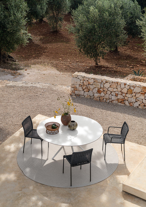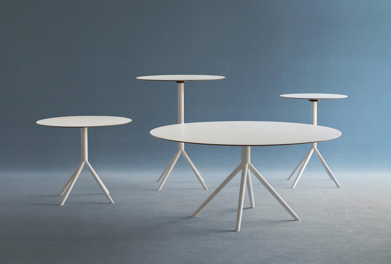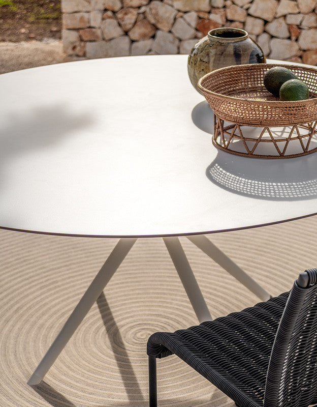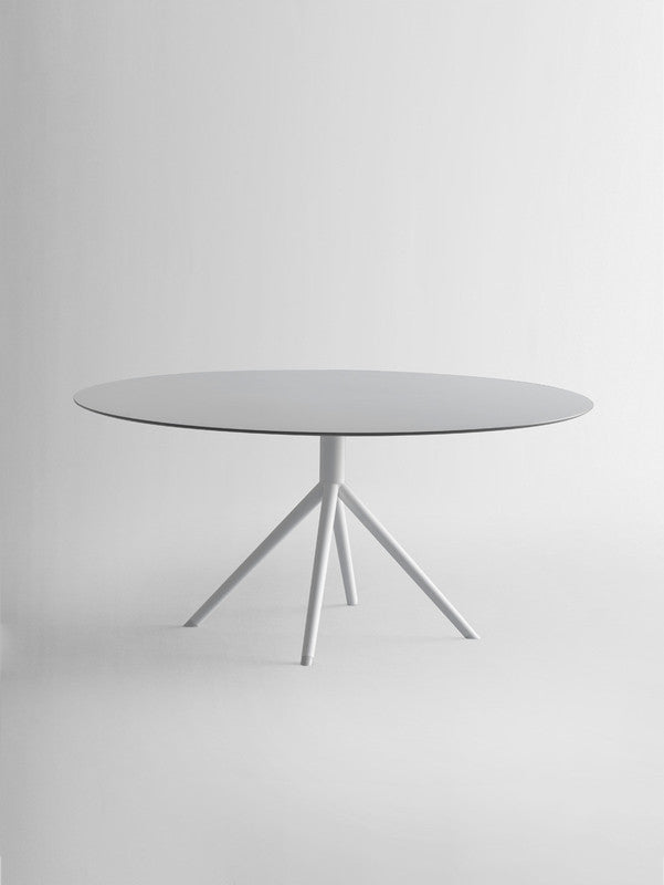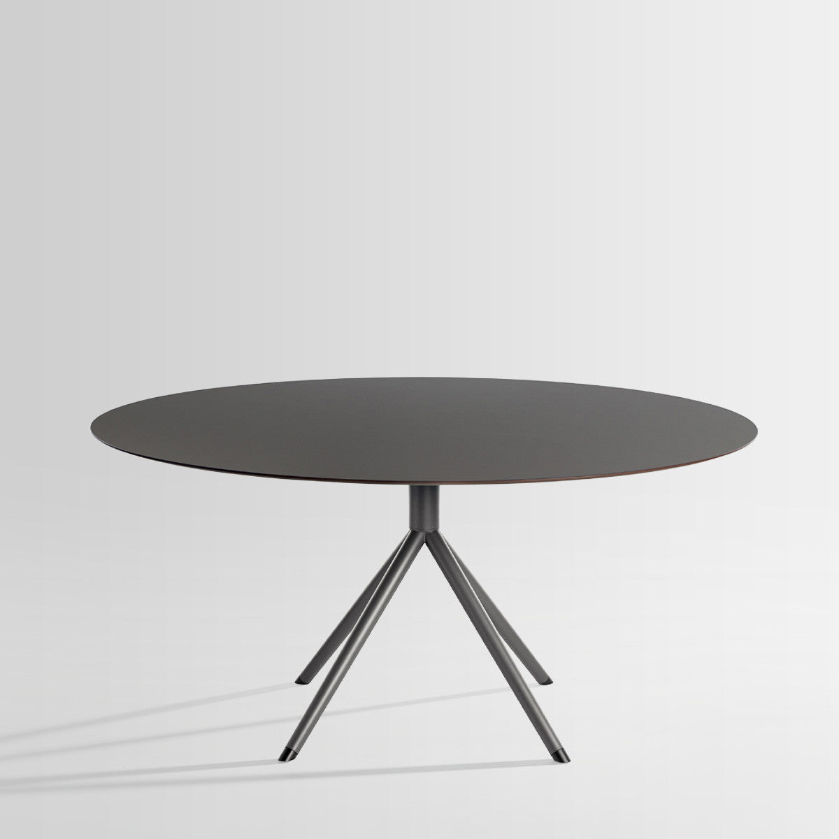 Versatile and with an essential design, the OTX table with central leg and four feet, is declined in the dining version Ø128 e Ø158cm, with painted metal base and HPL top in the finishes as per collection