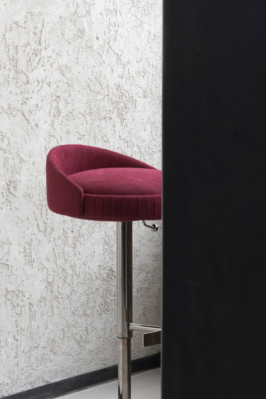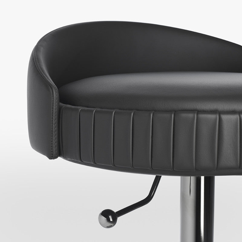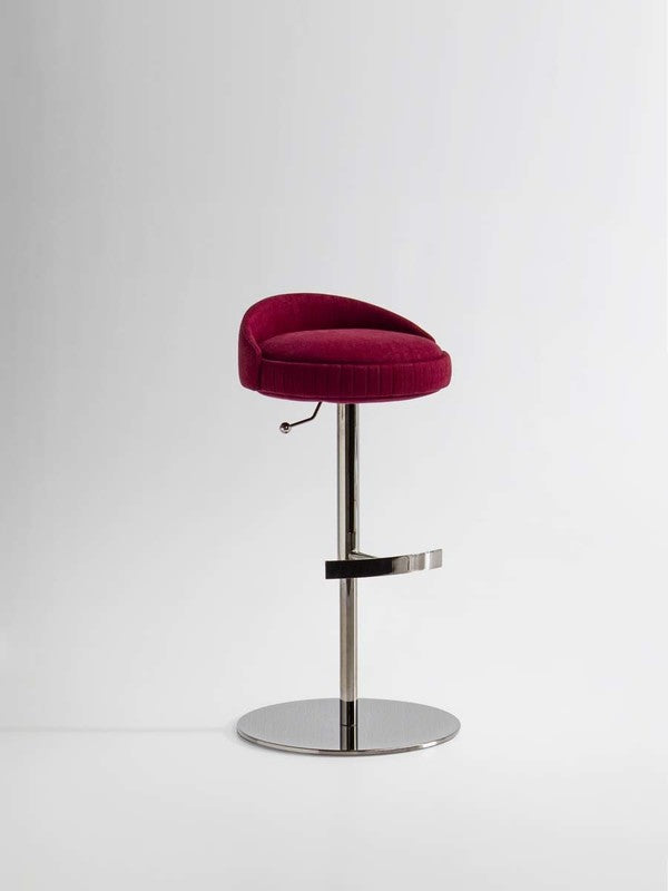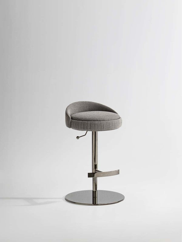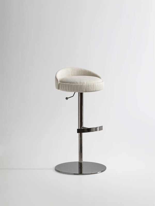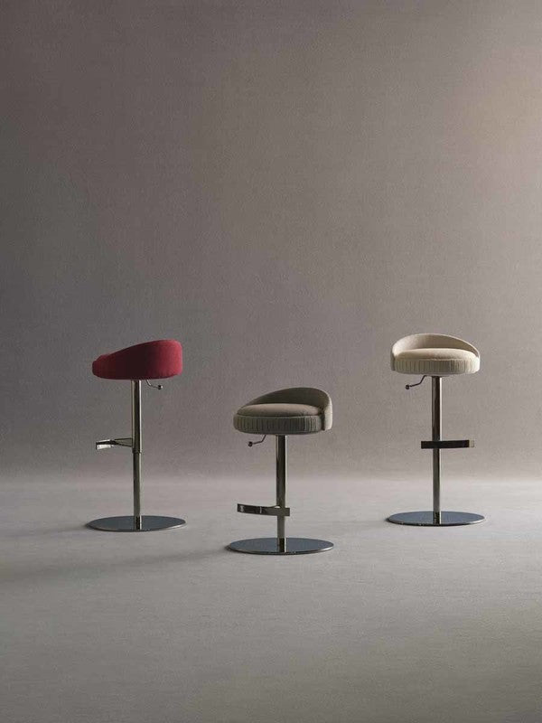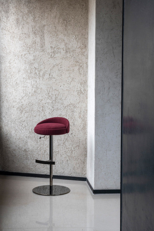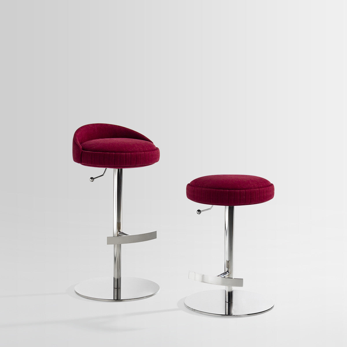 The Plissé stool, available with or without backrest, has a metal swivel central base with gas lift system. Materials and coverings as per collection.