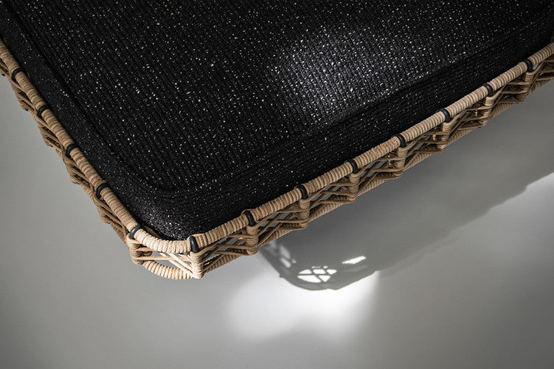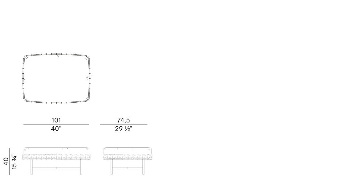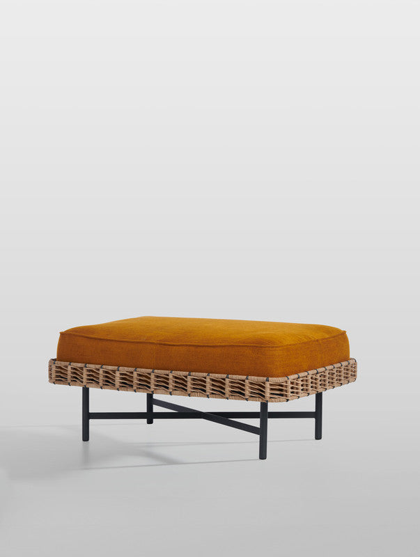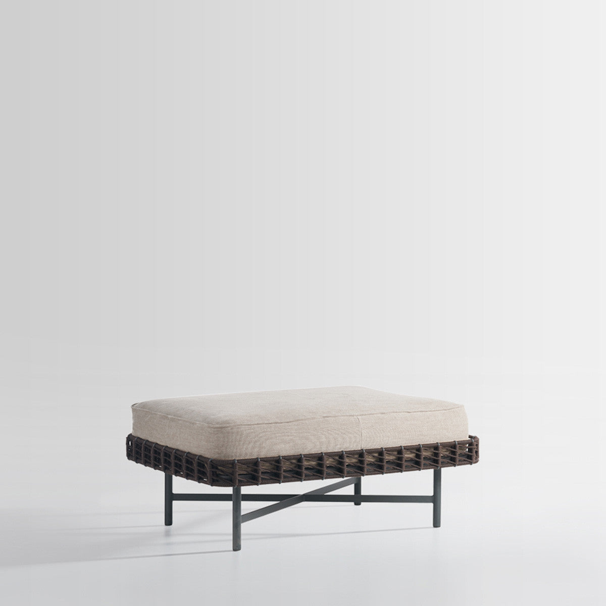 The rectangular Ropu pouf consists of an embossed painted metal structure and an upholstered seat cushion, padded in fire retardant polyurethane foam, upholstered in the fabrics and leathers as per collection. The frame is hand woven in hide-leather cord.