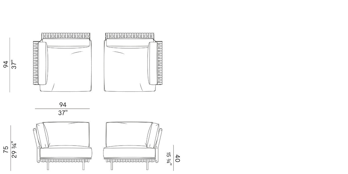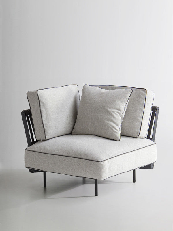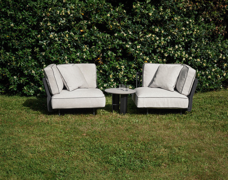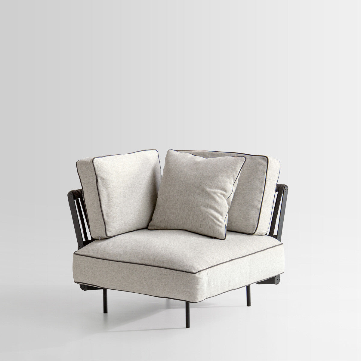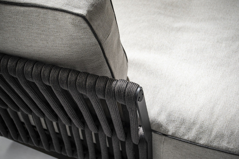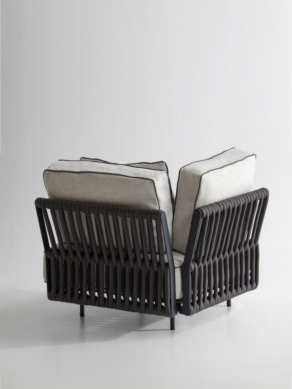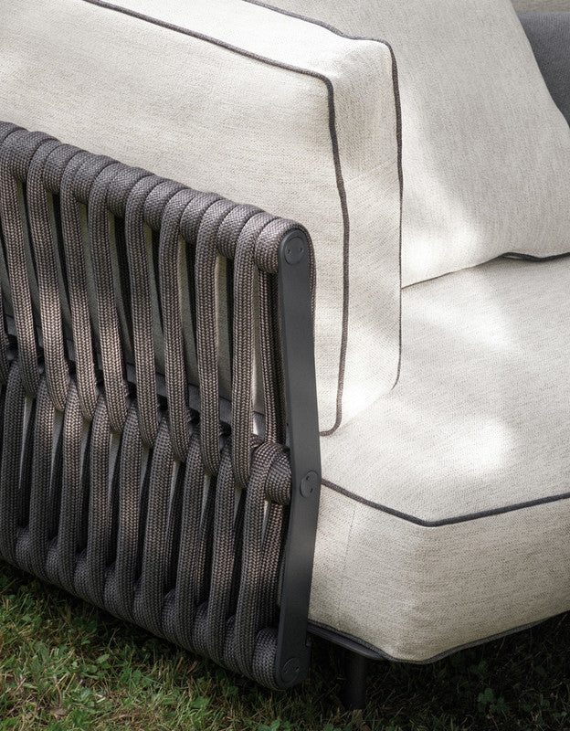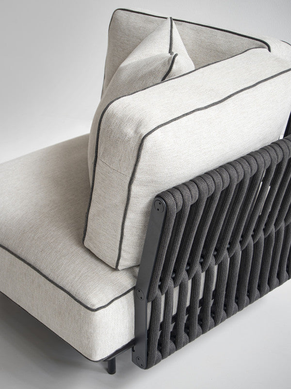The enveloping and comfortable backrest in anthracite padded braid has a padding in fire-retardant polyurethane foam with Waterproof undercover and external lining as per collection and contrasting piping.