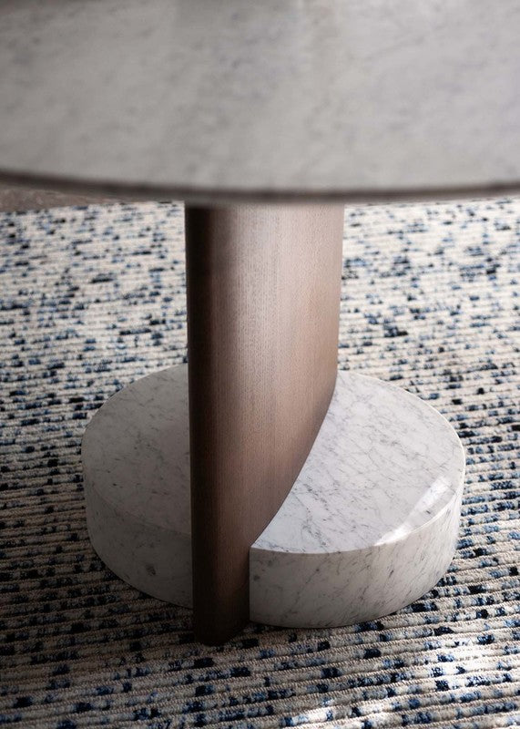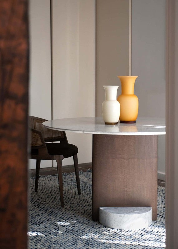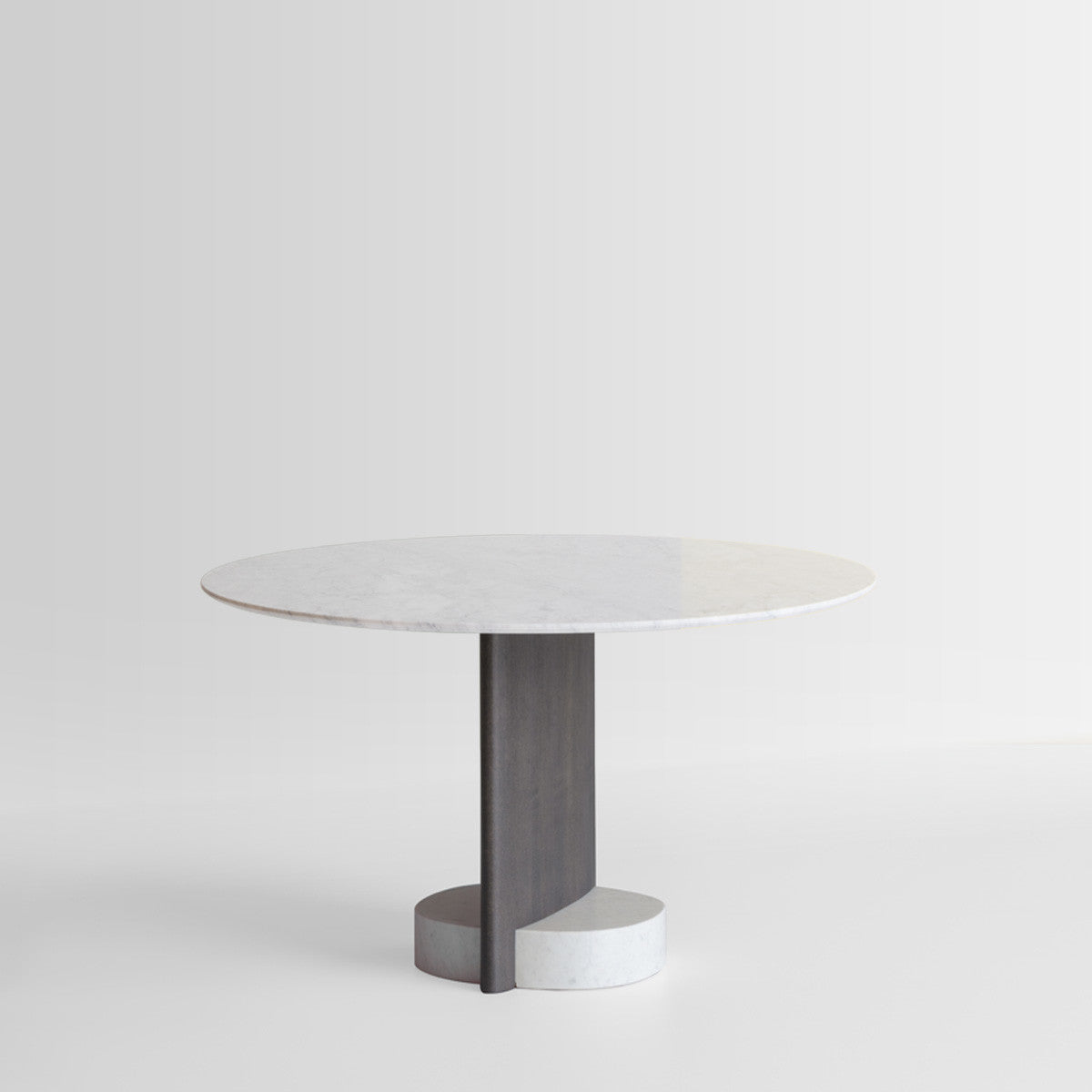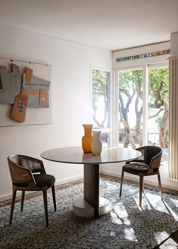 The Syn collection investigates the relationship between multiform volumes that combine to create a unique piece of furniture. This family is declined in two dining tables, with round and rectangular tops, whose protagonist is the base composed of an interplay of shapes and materials.