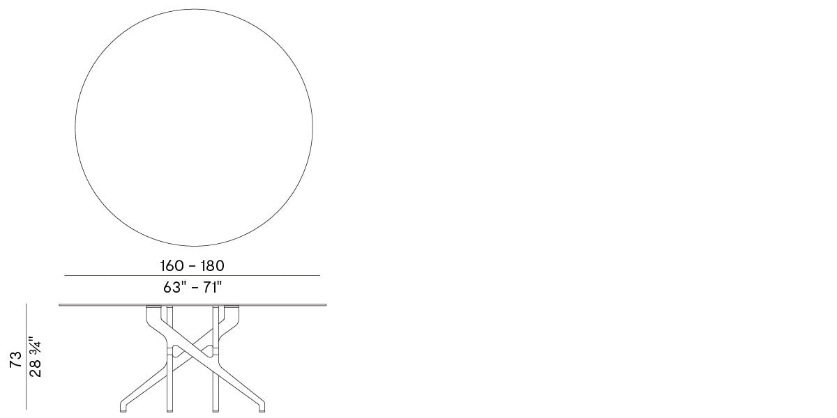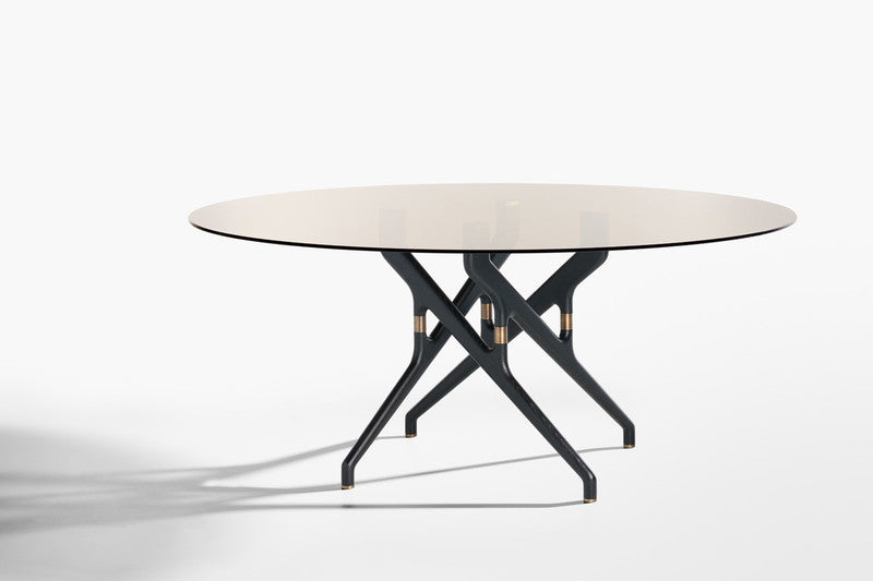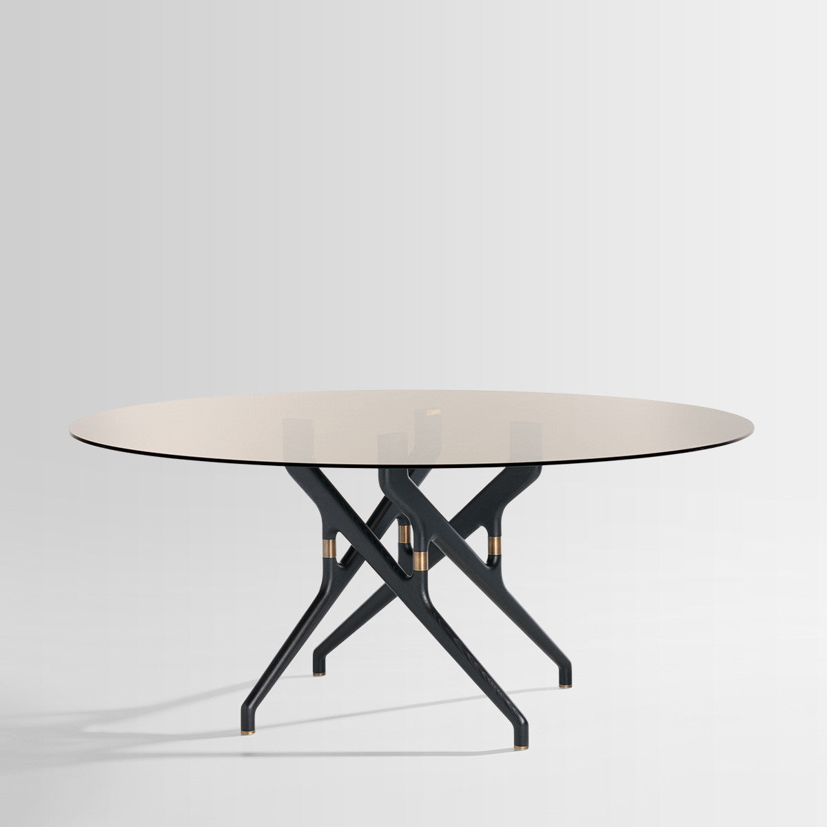 Round table with structure in solid ash wood or Canaletto walnut and details in bronzed brass. Available with single structure. Top in ash wood, Canaletto walnut and bronzed tempered glass.