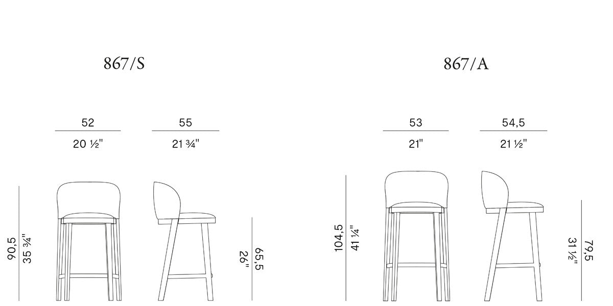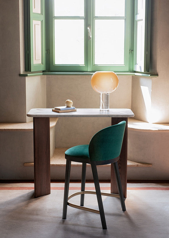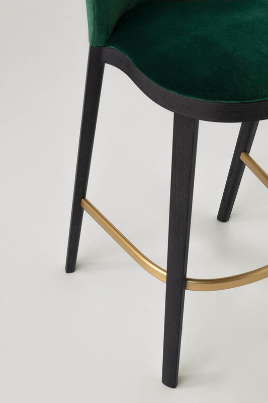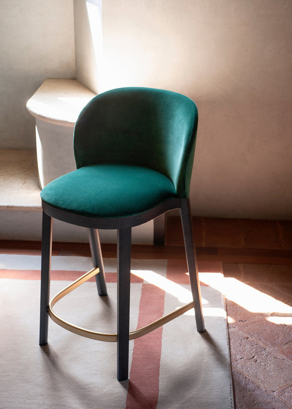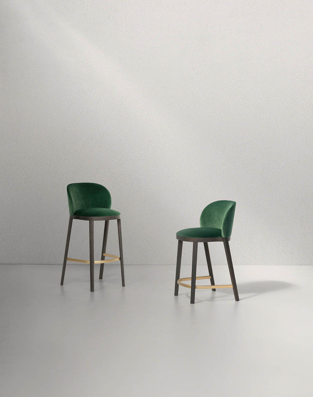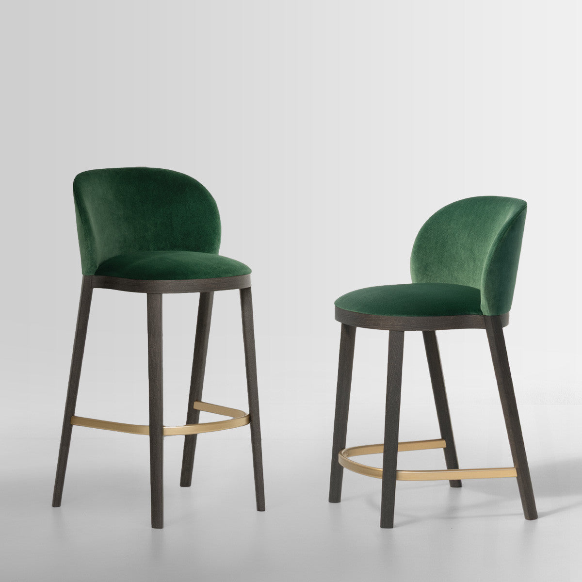 The Trousse stool stands out for its soft, welcoming profile, perfect for enhancing contemporary dining, bar and lounge areas. Made of solid ash, with footrests in satin gold or bronzed brass metal, it combines soft lines with essential design. The upholstered seat and back provide maximum comfort, with upholstery available in fabrics and leathers from the collection or upon request.