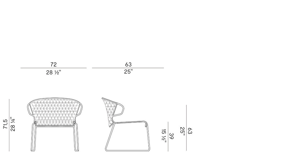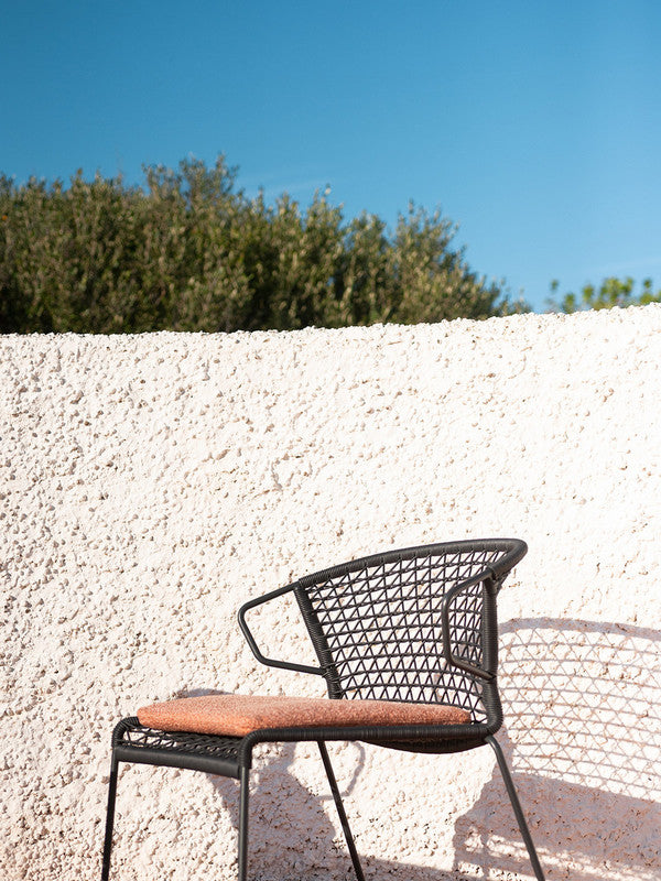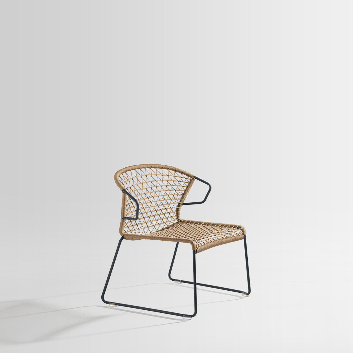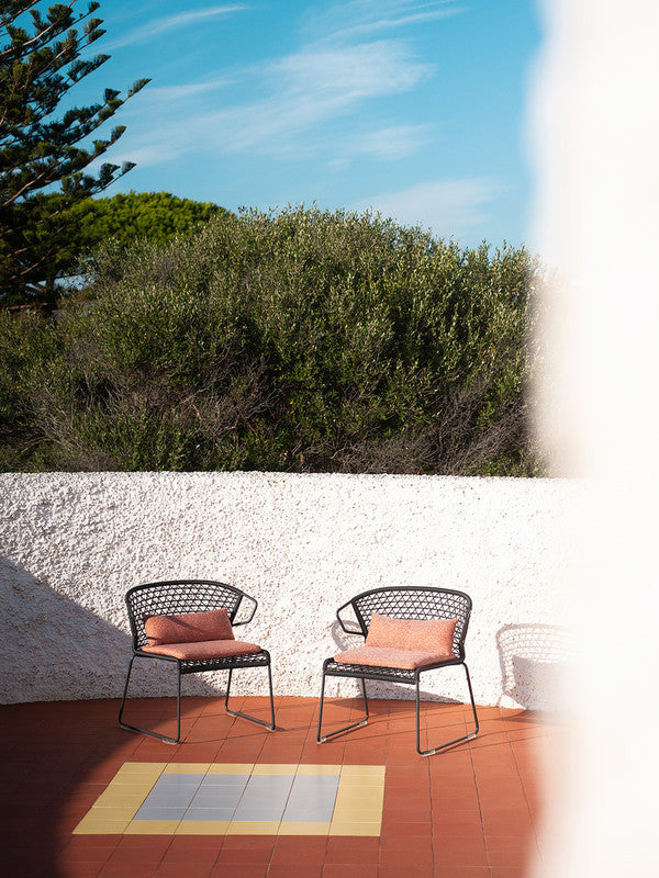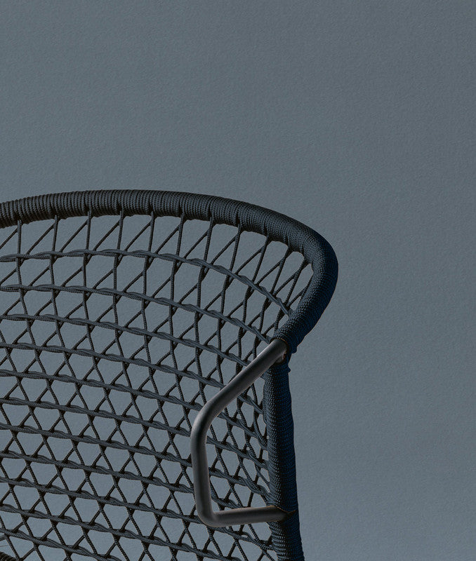 Characterized by a slender frame in painted metal tube with sled-shaped legs, and weaving in nautical or PVC rope, the Vela stackable armchair represents the ideal interpretation of Potocco's in-out-in concept.