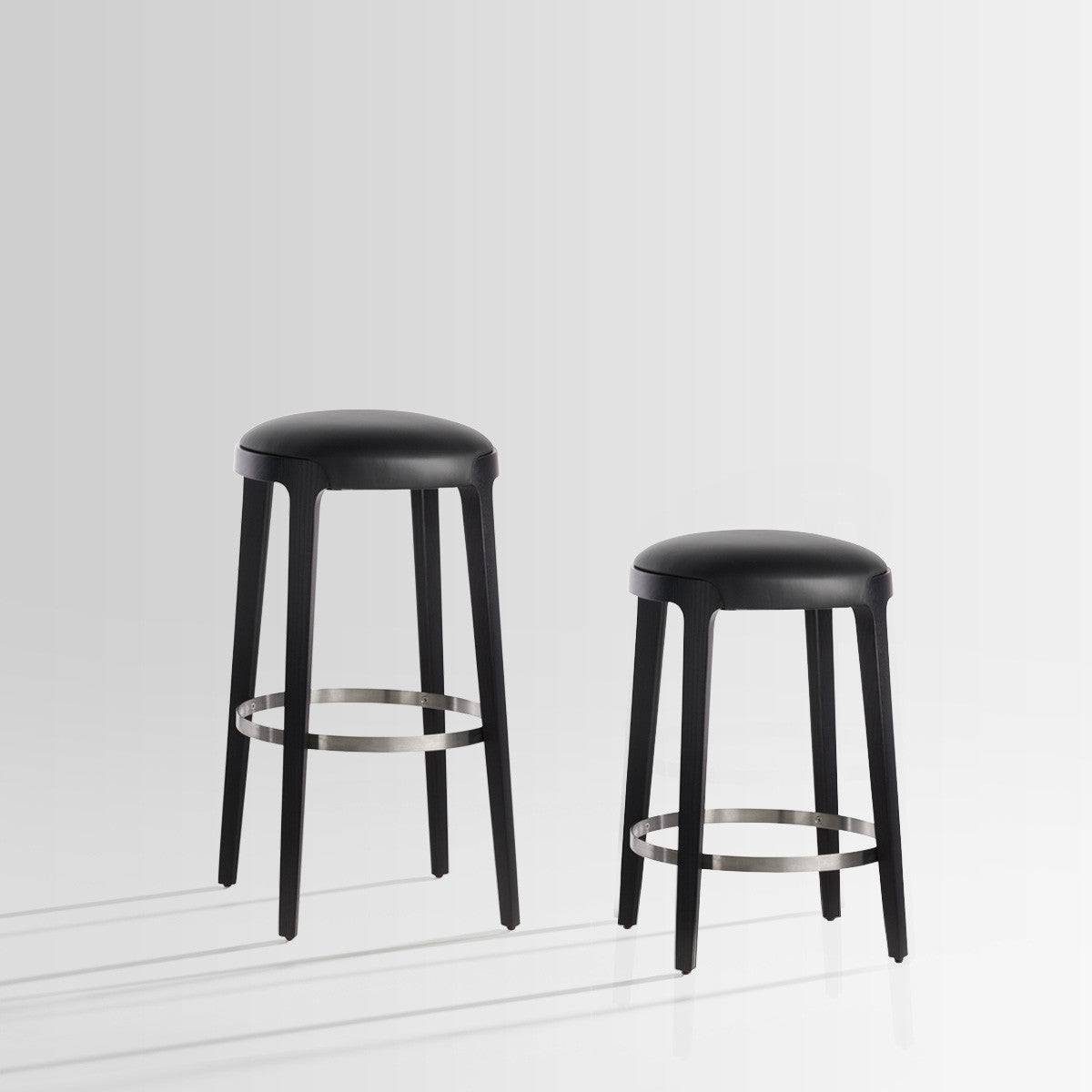 In the version with circular upholstered seat without backrest, Velis stool completes all needs, from home to contract, in an ideal mix of refinement and functionality. Seat padded in fire retardant polyurethane foam with details in solid ash wood.