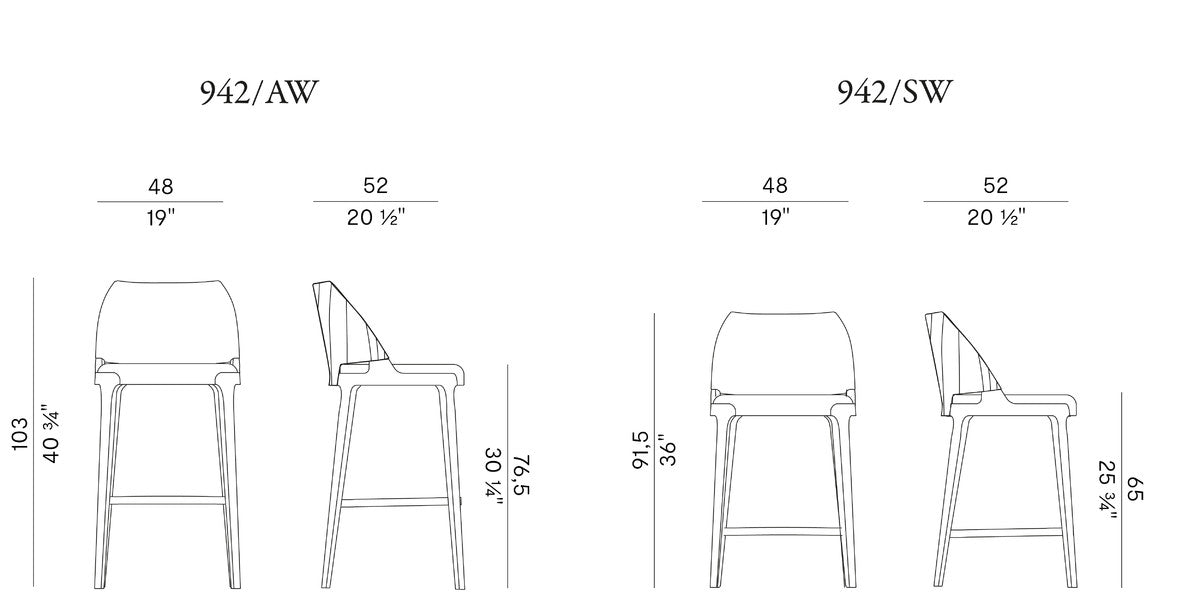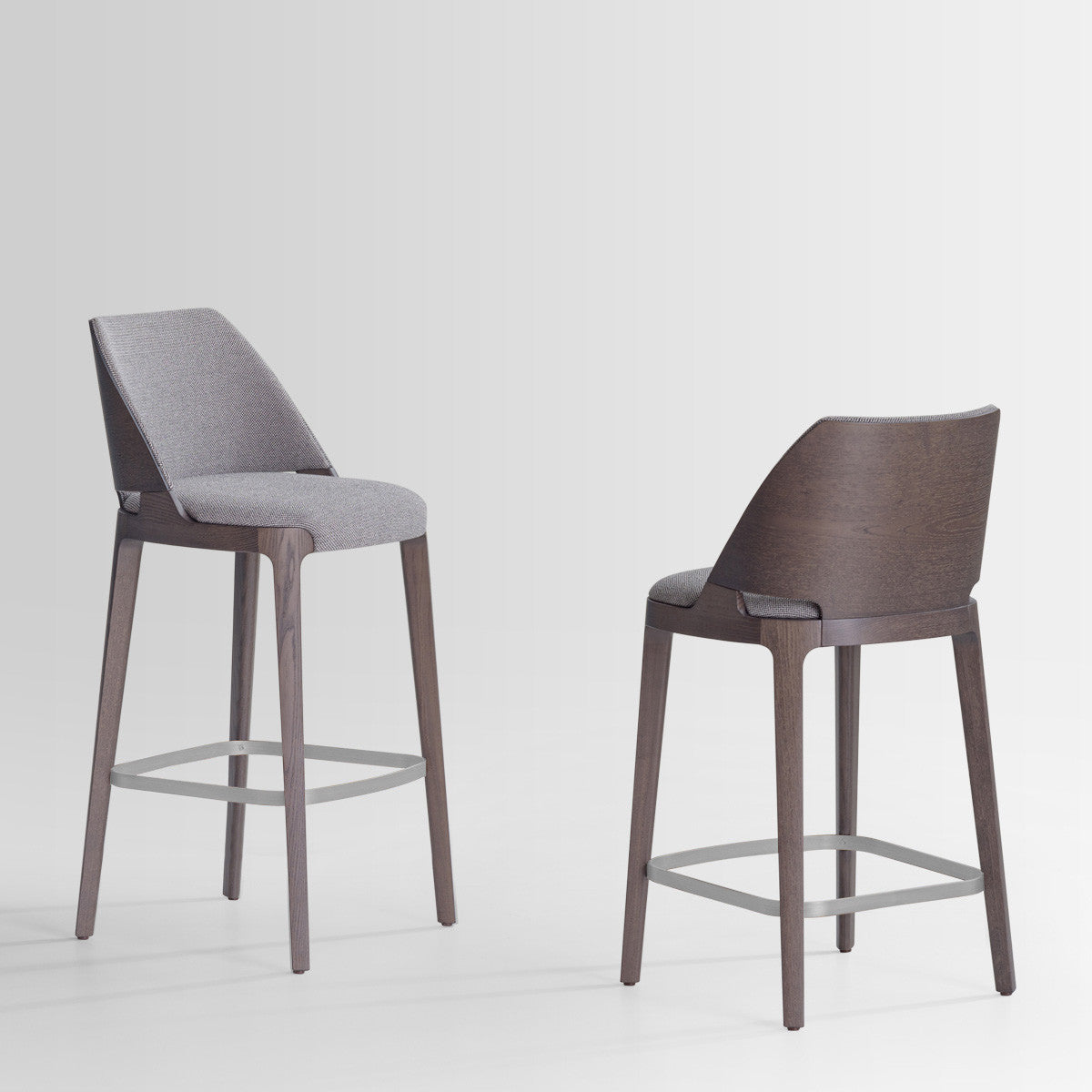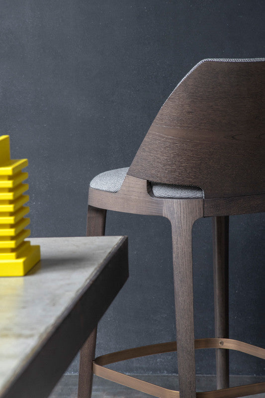 The already wide collection, presents a new version of the stools in two heights, with external backrest entirely in Canaletto walnut or ash wood. The seat is padded in fire-retardant polyurethane foam and is available in the various indoor coverings as per collection.