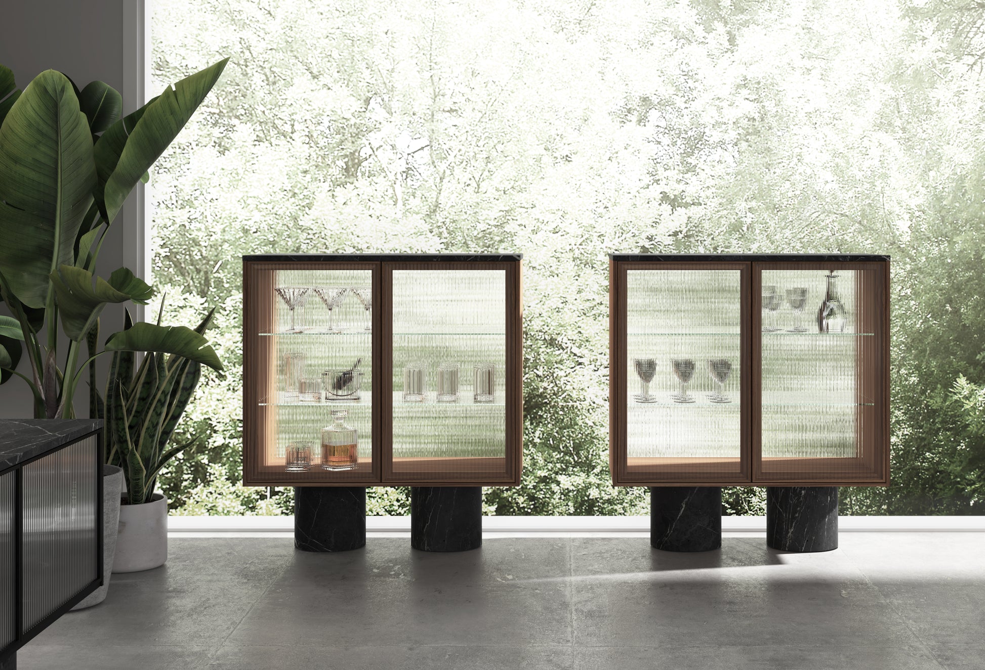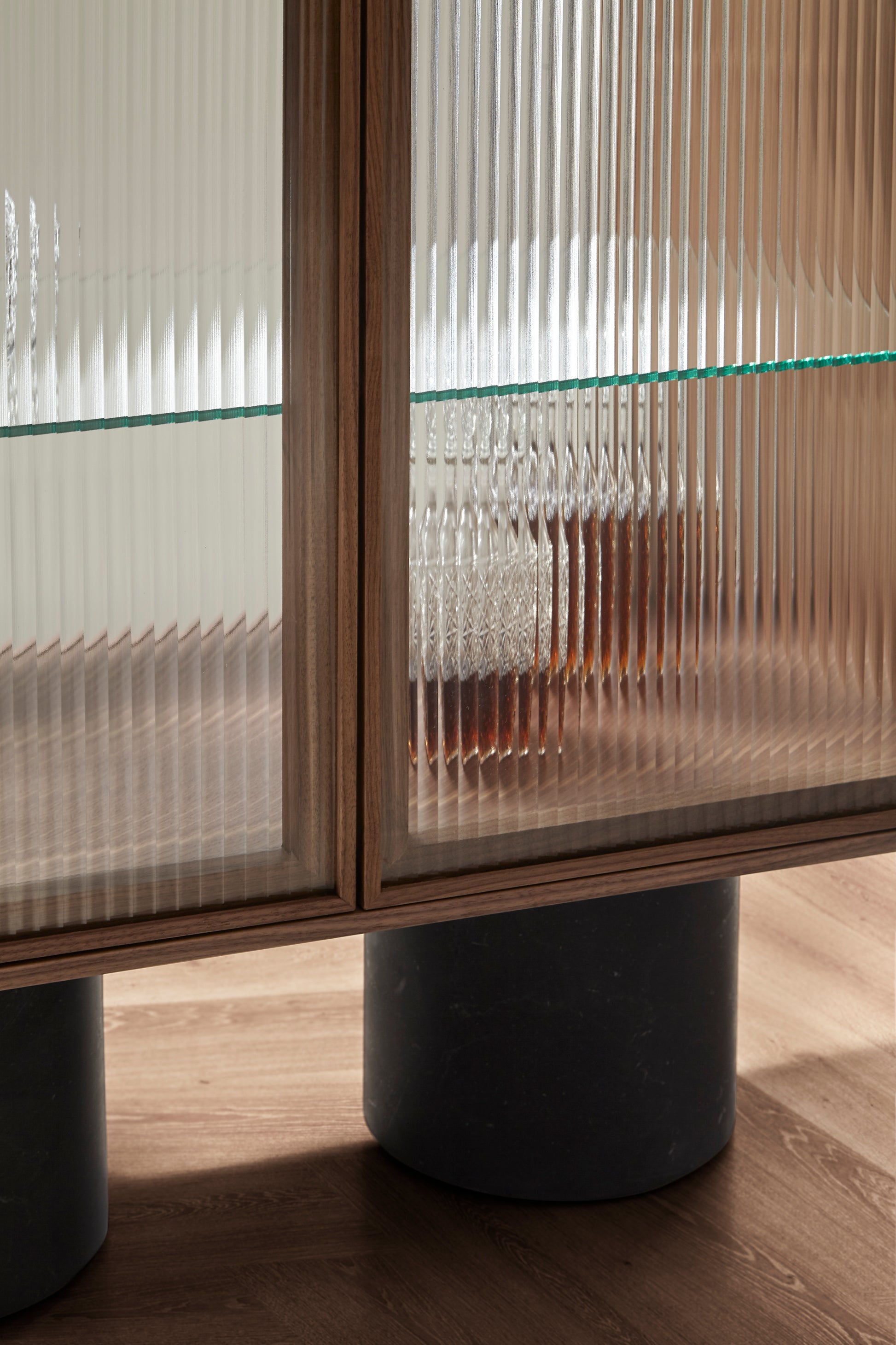 "The Rio collection builds on my fundamental design language by working with honest, artisan and local materials to achieve unique designs. For Punt I selected solid wood, structured glass, marble, textile and brass to create a collection of cabinets and lamps. Rio is about the balance of materials and the balance of proportions," Sebastian Herkner. The Rio sideboards have in common that they are all set on solid marble cylinders. They provide stability and grandeur in contrast to the precise and finely crafted cabinetry above. The slender wooden frames and push-to-open doors with different inlays such as structured wood are a kind of bridge between the two pedestals. The dialogue between all components creates a sophisticated character.