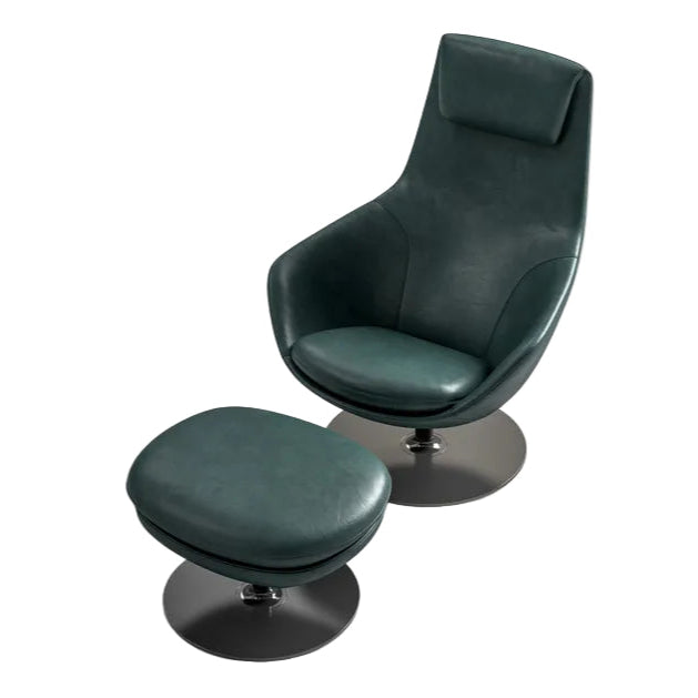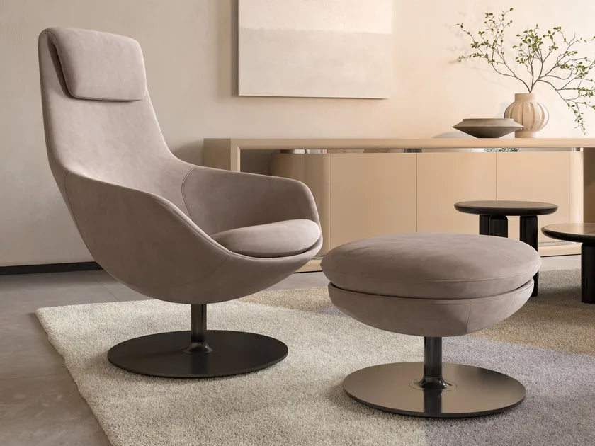 SAM is a bergère armchair with armrest, metal base and a fitting ottoman, both upholstered in leather or fabric.