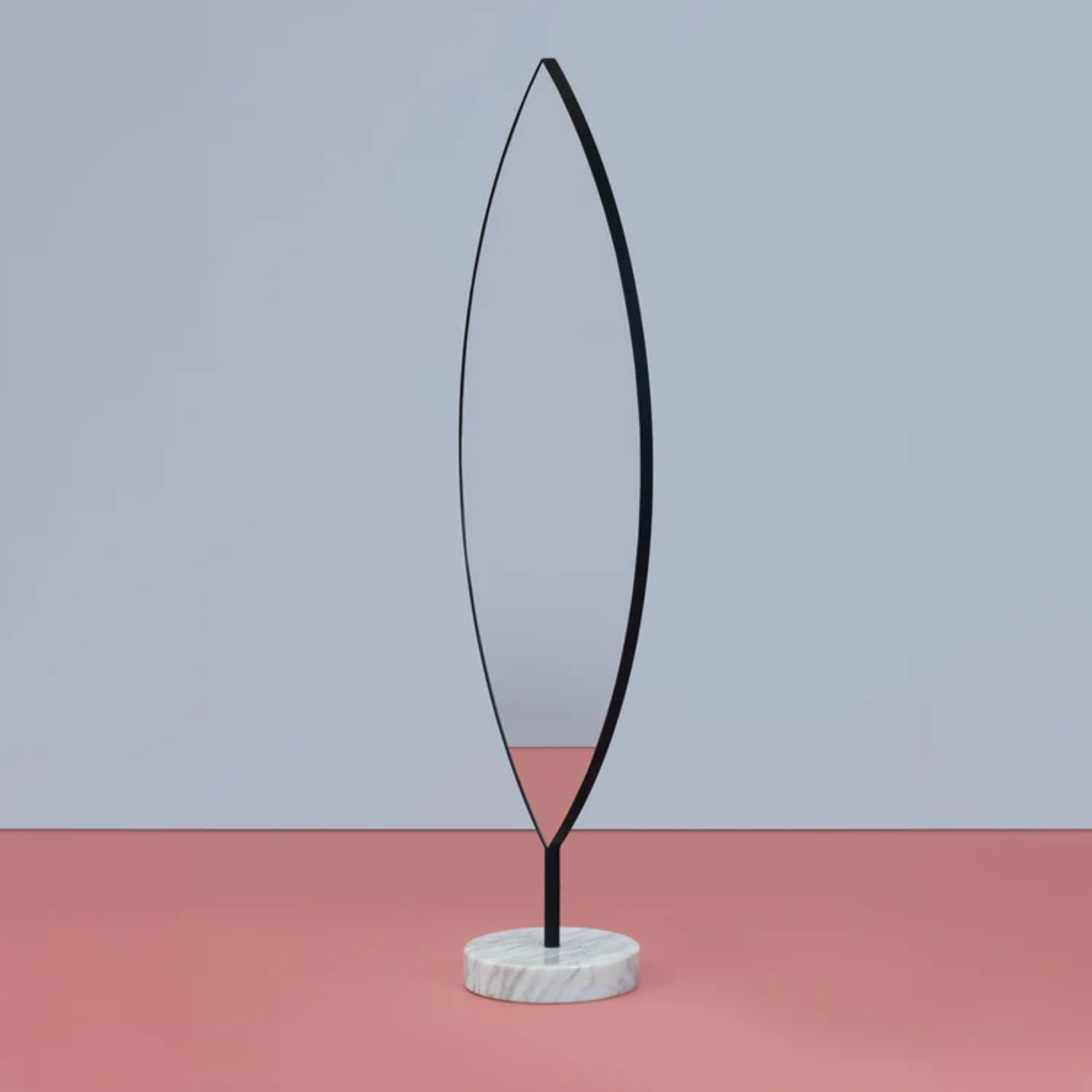 The Aglaia Mirror by Artefatto Design Studio beautifully captures nature's essence. It features a Premium Calacatta marble base and a Jet Black metal lacquered structure, offering a striking contrast. The back is crafted from Natural Walnut wood, with a seamless design that mirrors the growth of leaves. The Extra Clear Mirror provides clarity and elegance, while the central seam enhances the visual symmetry.