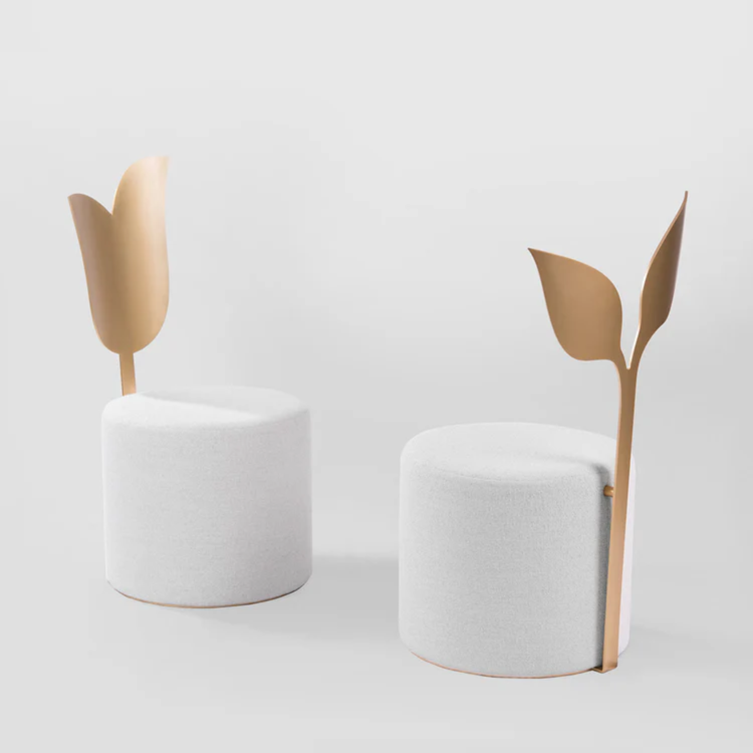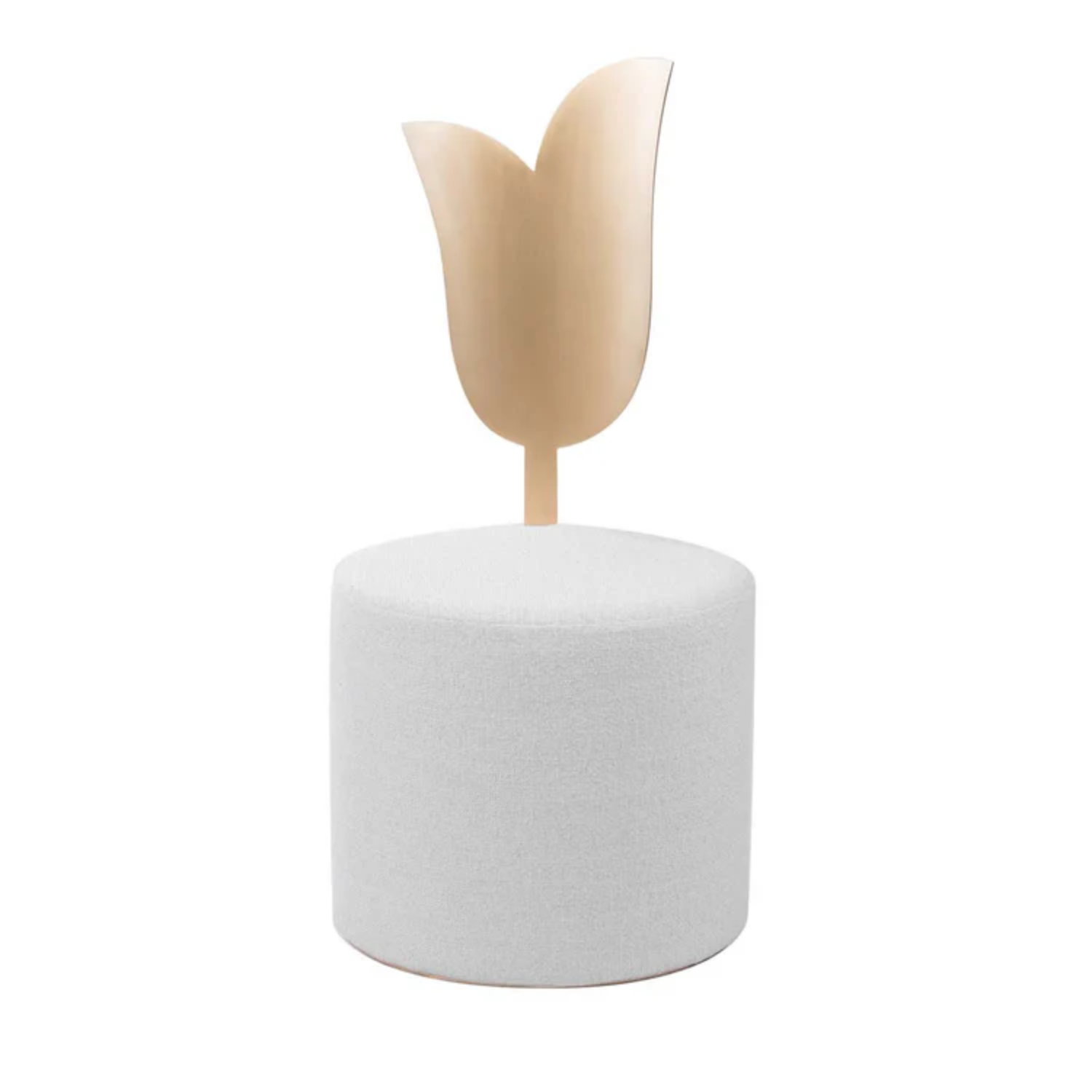 The Giardino Botanico Lily Pouf by Artefatto Design Studio features a curved backrest inspired by botanical shapes. Upholstered in Standard Cocò Desert Storm, it adds a modern and earthy tone to any space. The pouf is supported by a Satin Brass metal structure, enhancing its elegant design. It is available in various metal finishes and stained solid wood, making it a stylish and functional accent piece for contemporary interiors.