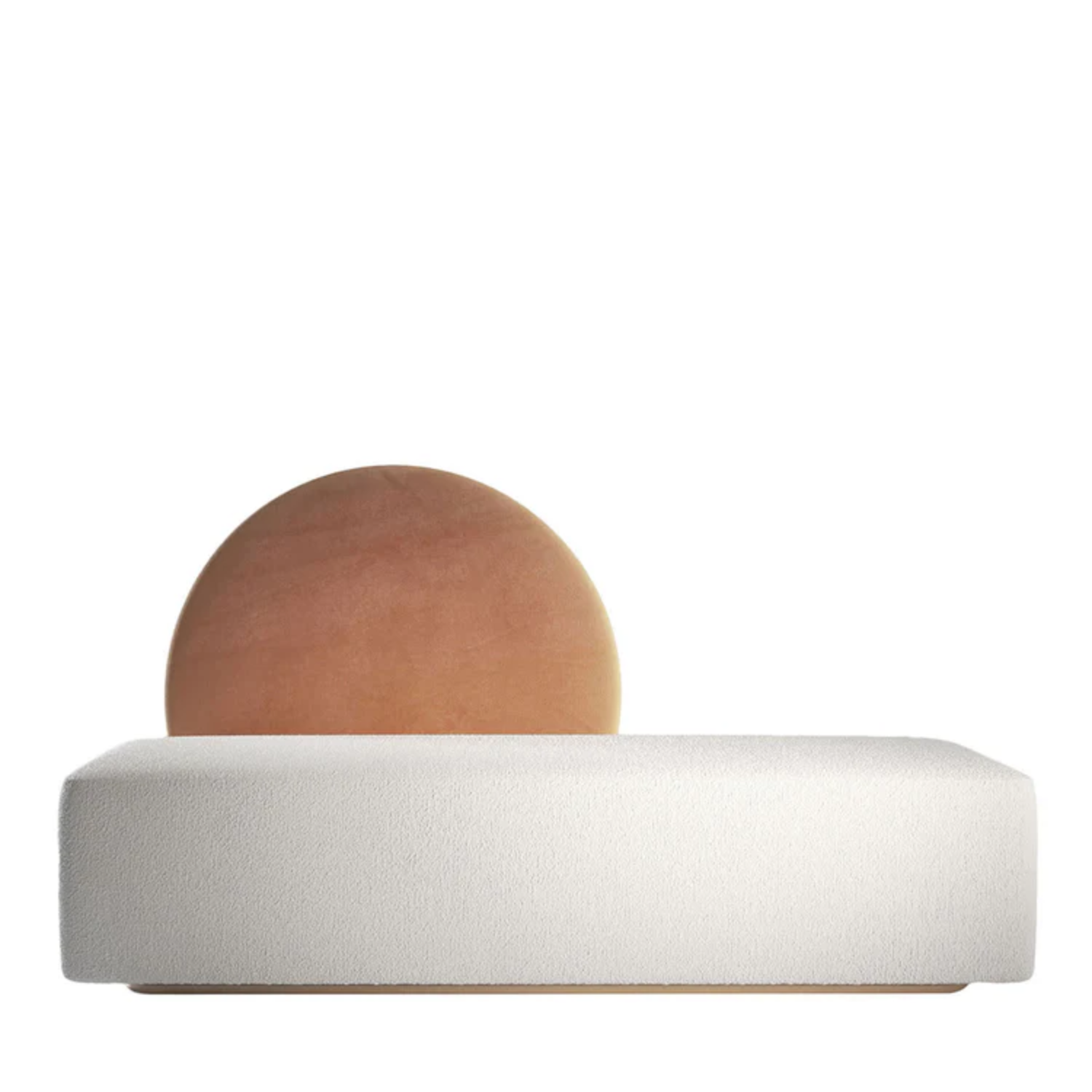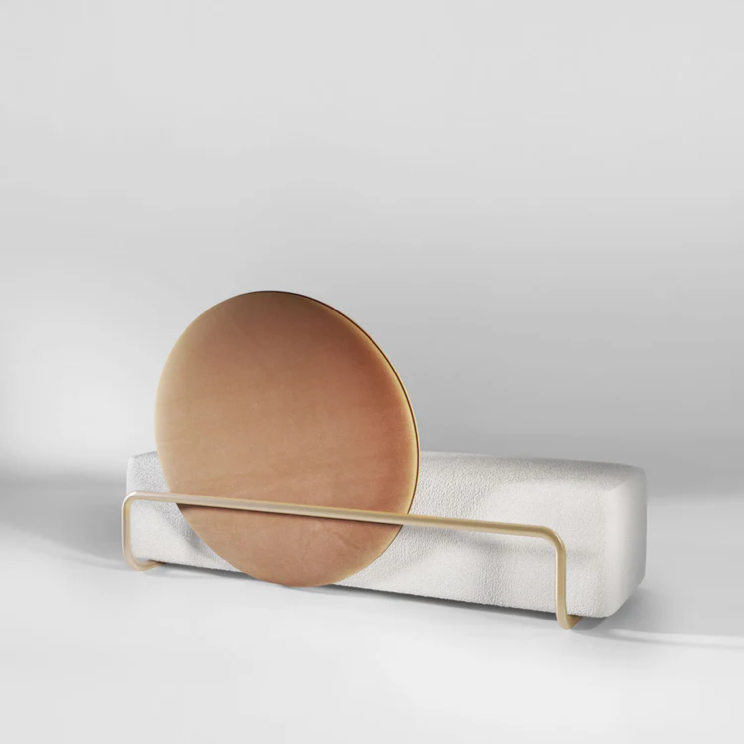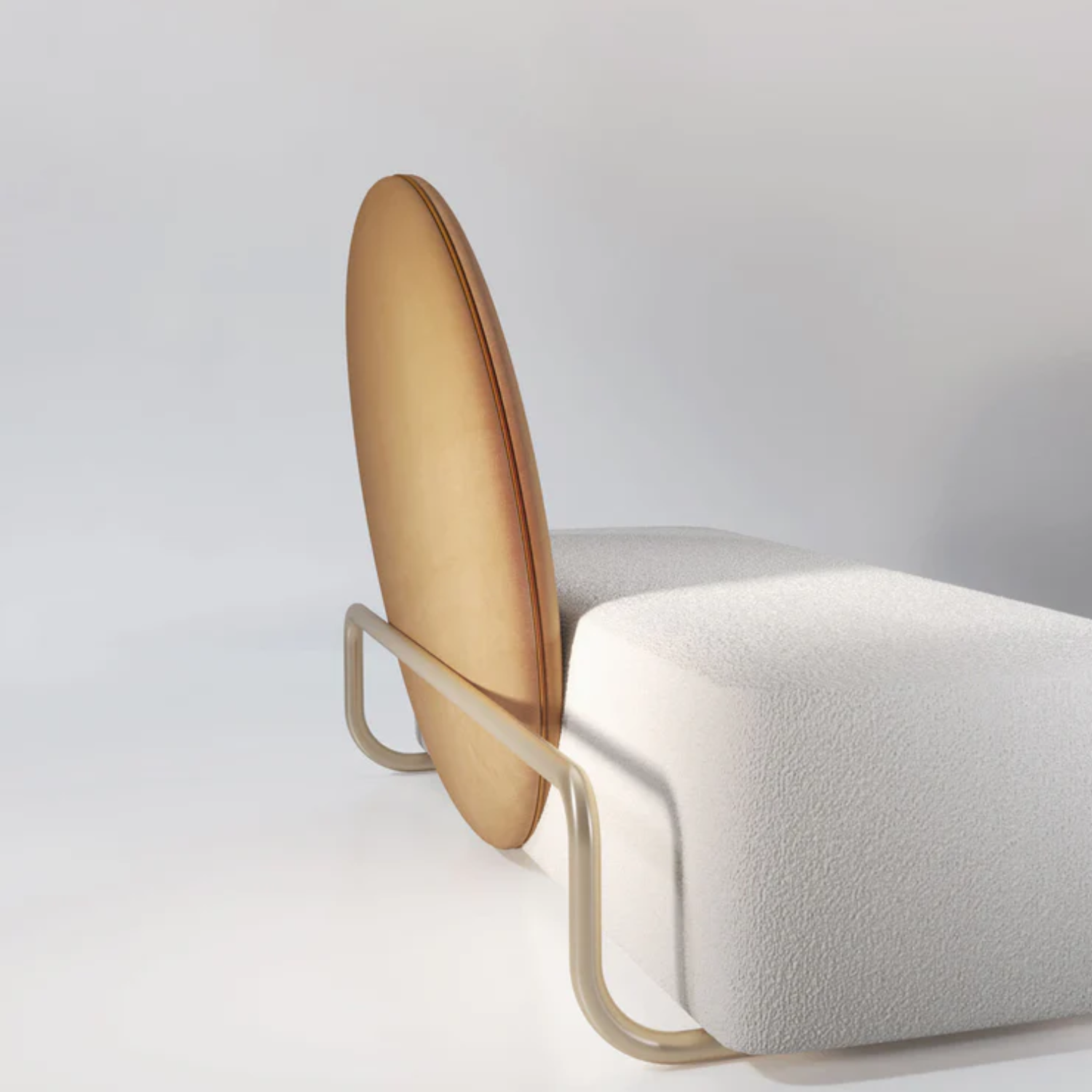 The Horizon Sofa by Artefatto Design Studio combines flexibility and style. Featuring a Standard Cocò Desert Storm seat and a reversible Velvet Cognac back, its circular backrest rotates on a Satin Brass metal frame, allowing for a change in look. With options for dual-fabric backrest upholstery and various metal finishes, it brings both functionality and sophistication to any setting.