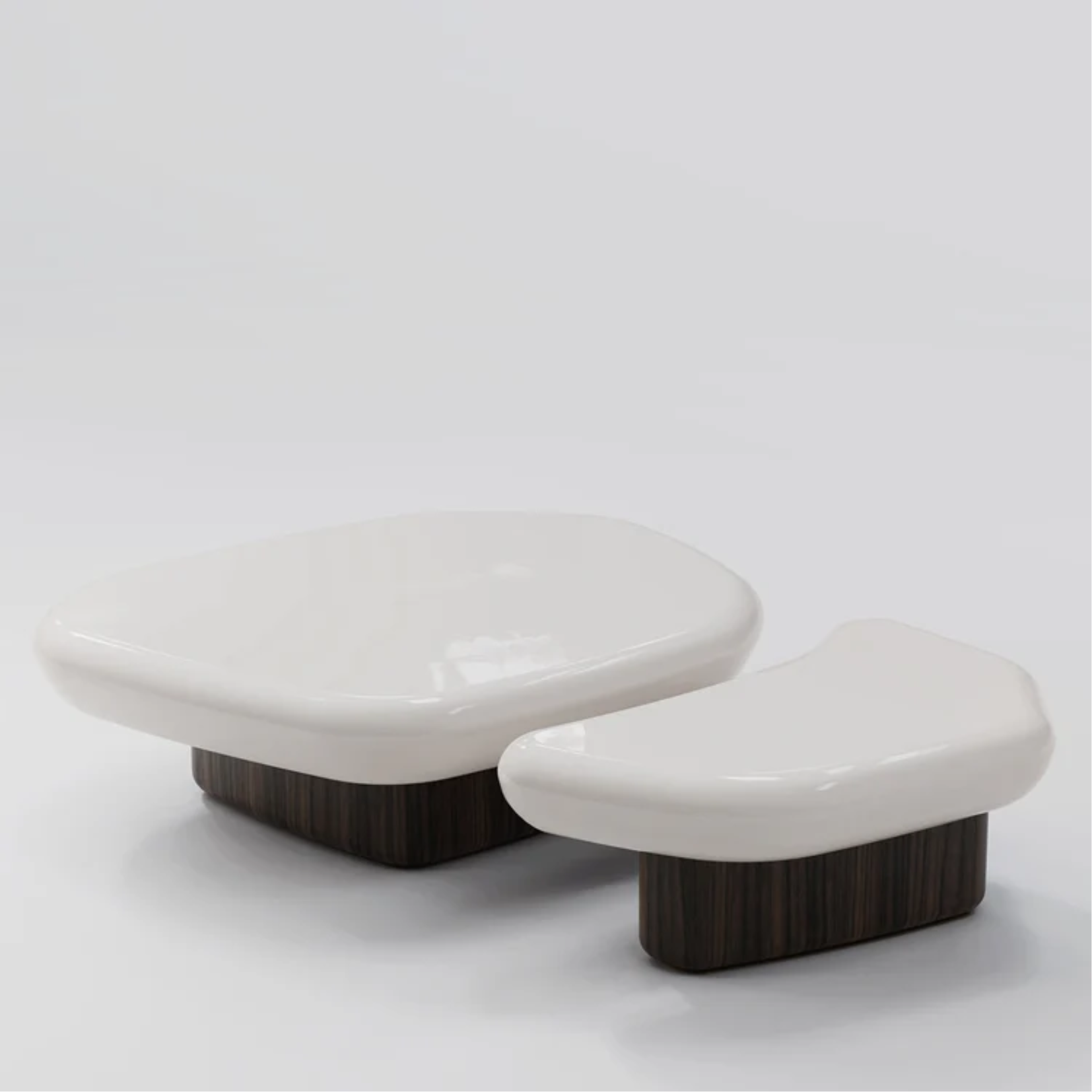 The Kawa Minor Coffee Table, designed by Artefatto Design Studio, features a glossy tortora wood lacquered top paired with a dark stained walnut base, combining elegance and durability. Inspired by the natural shapes and textures of pebbles found on the beach. It can be used individually or together, offering flexibility and functionality in your living space. Available in different finishes, it enhances any modern interior.