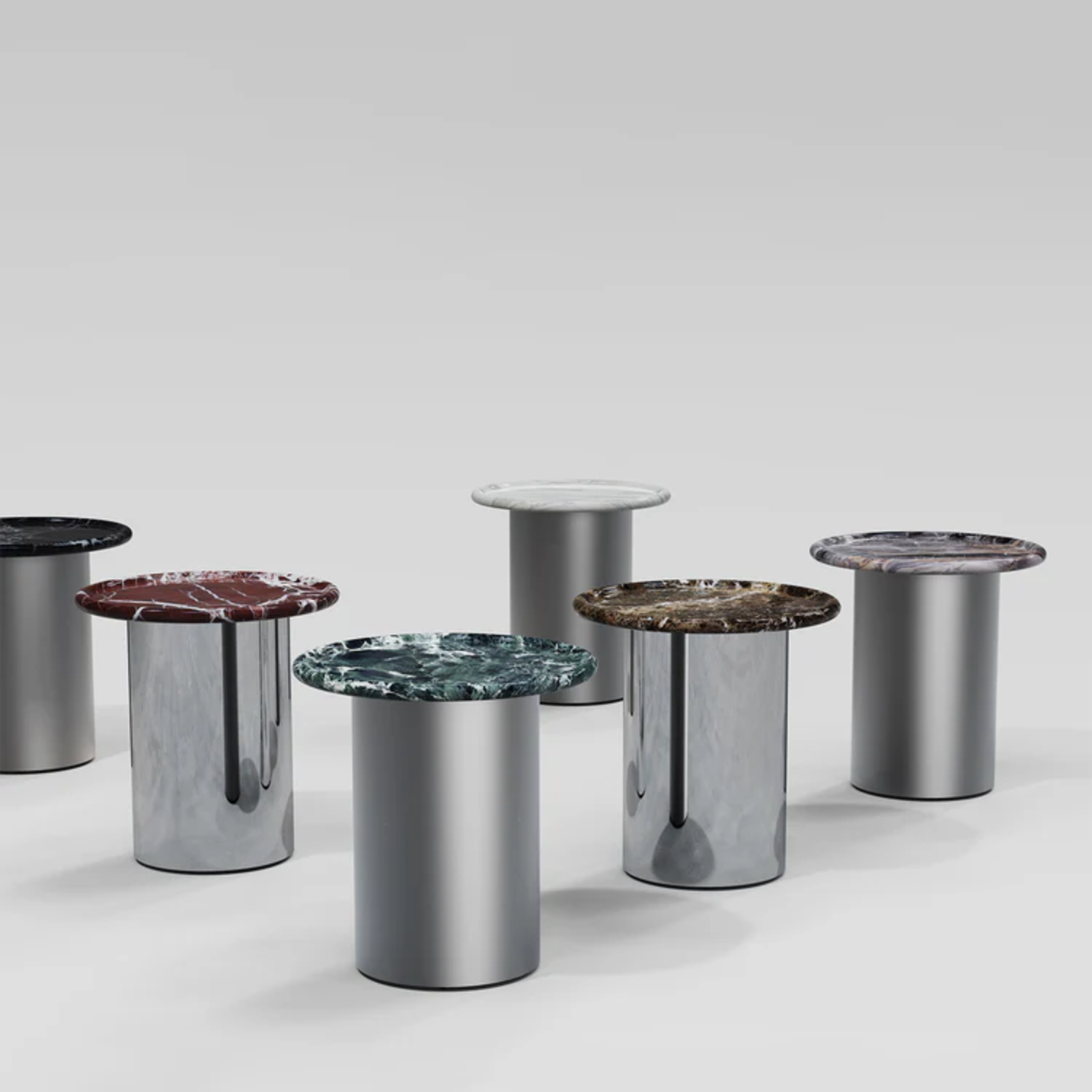 The Orbitae side table features a striking round rosso levanto marble top that showcases intricate natural veining, providing depth and visual interest. This table is supported by a polished aluminium pedestal base designed to be understated, allowing the marble to remain the focal point. Part of a versatile collection, orbitae is available with various metal finishes and stone options, making it adaptable to refined interior settings.