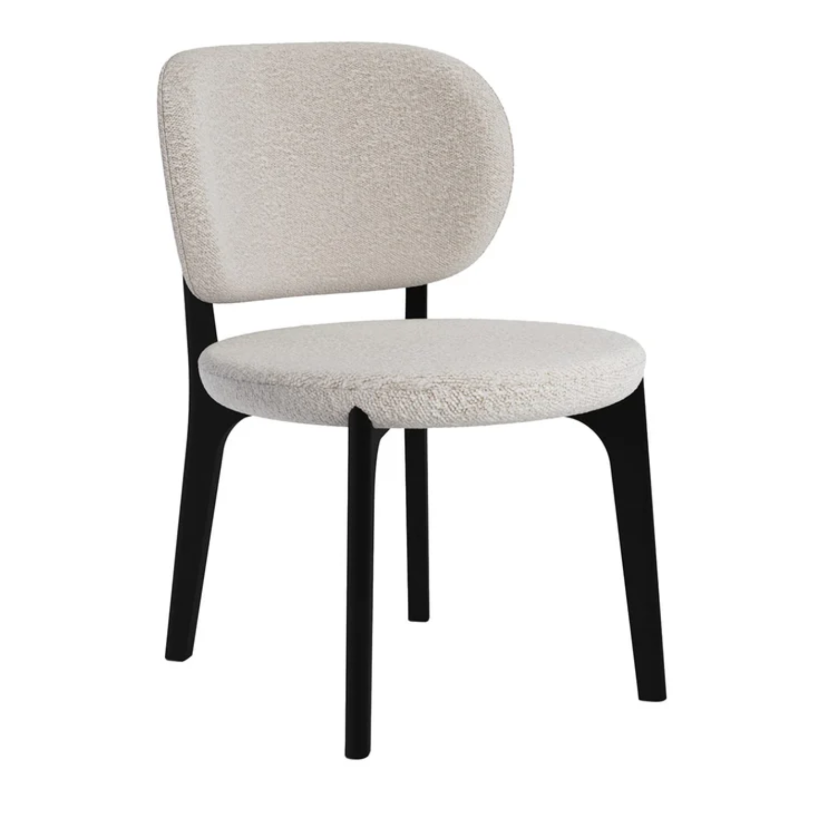 The Richmond Lounge Chair by Artefatto Design Studio is upholstered in Special Bouclé Pearl Bush, paired with a Dark Stained Walnut wood structure, creating a harmonious blend of elegance and comfort. Featuring a curved backrest, it is complemented by a plush, fully upholstered seat. Both the seat and back can be customized in any fabric, while the sturdy wooden frame offers a variety of finish options.