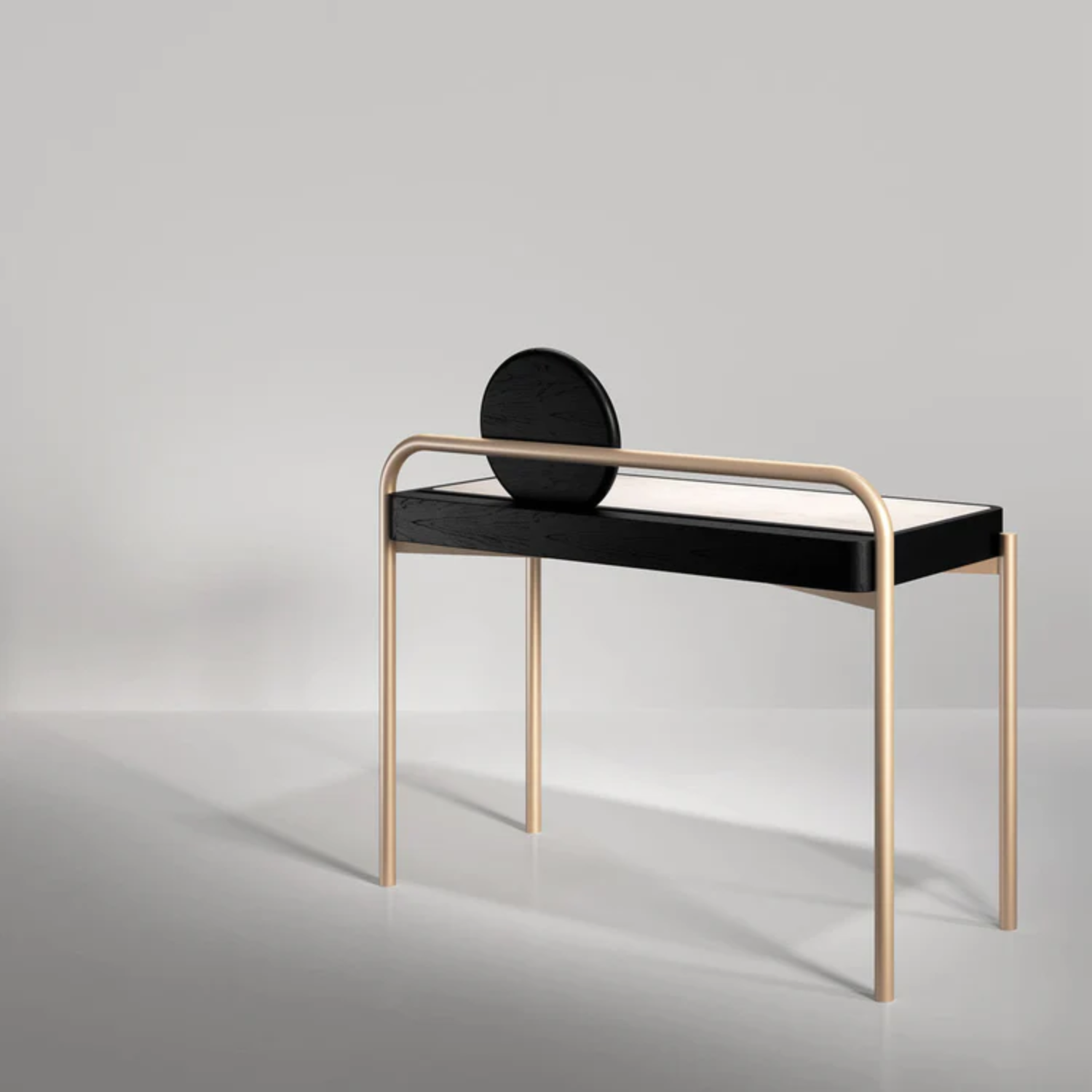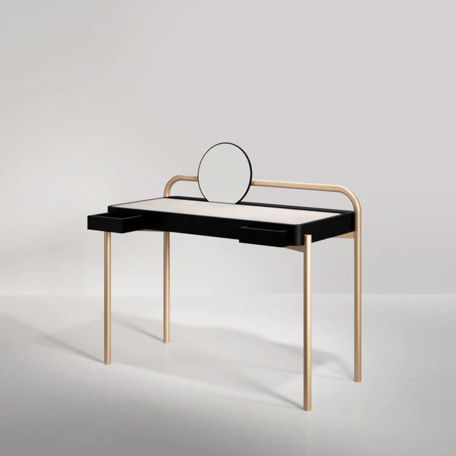 The Roll Desk by Artefatto Design Studio is crafted from Dark Stained Walnut wood, it features a Satin Brass metal structure and a Standard Carrara marble top, combining functionality with sophistication. The back legs form a continuous loop, supporting a rolling mirror, while the upholstered suede or leather top ensures comfort. Two drawers, lined with matching suede or leather, provide ample storage, making it a versatile addition to any modern interior.
