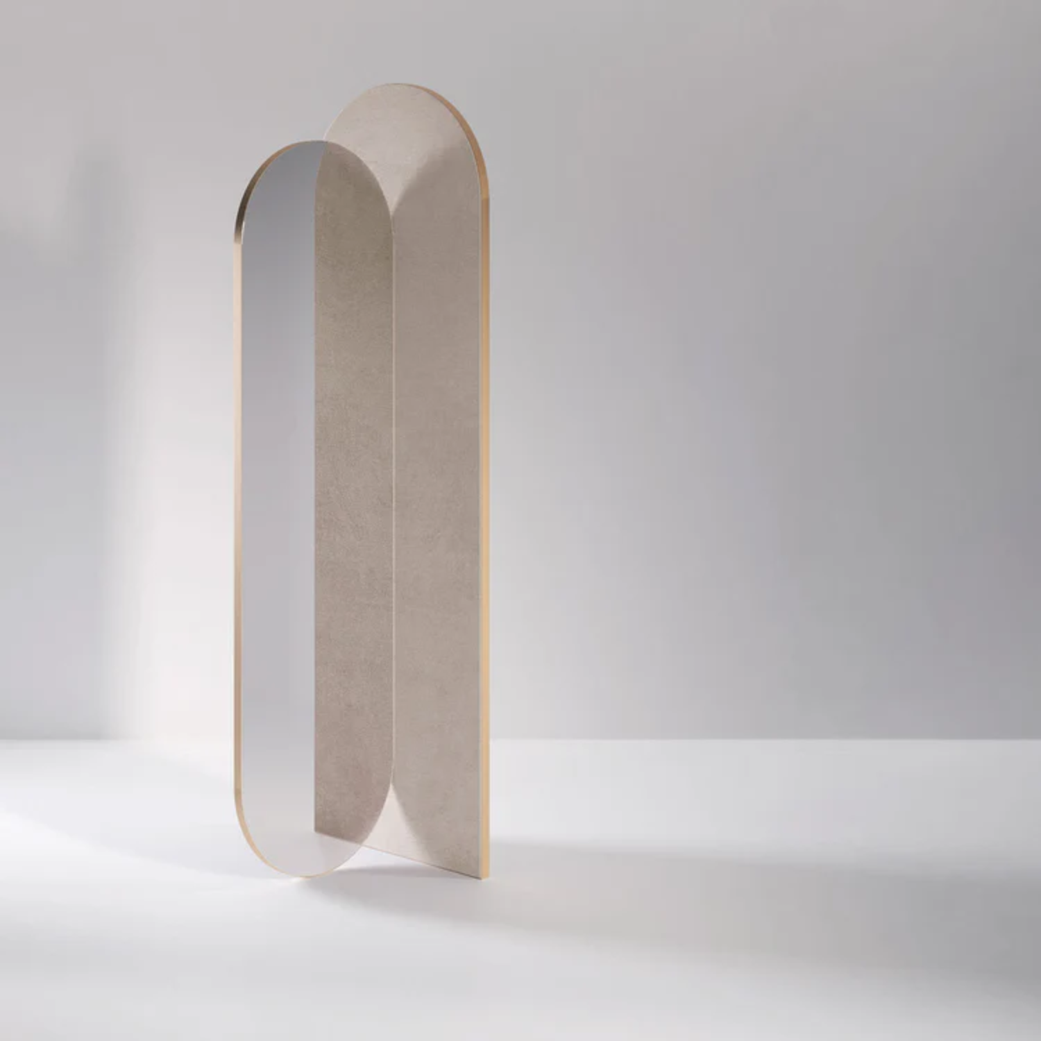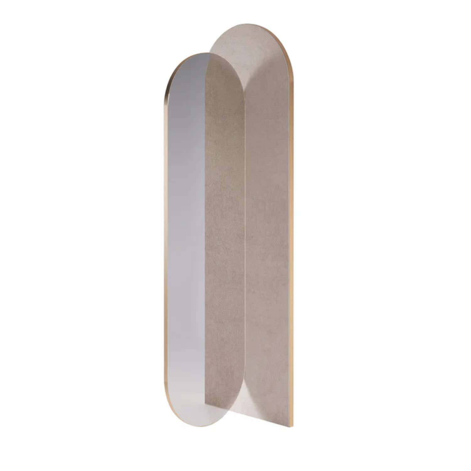The Takada Mirror by Artefatto Design Studio features a striking round design, stabilized by a separate supporting arch. Wrapped in a Polished Brass metal finish, it exudes elegance and modernity. The back of the mirror is upholstered in Special Bison Hide, providing a luxurious touch, while the arch can be customized with various fabrics or lacquered in any RAL color. The mirror, with its Extra Clear Mirror surface, serves as both a functional piece and a stunning focal point in any space.