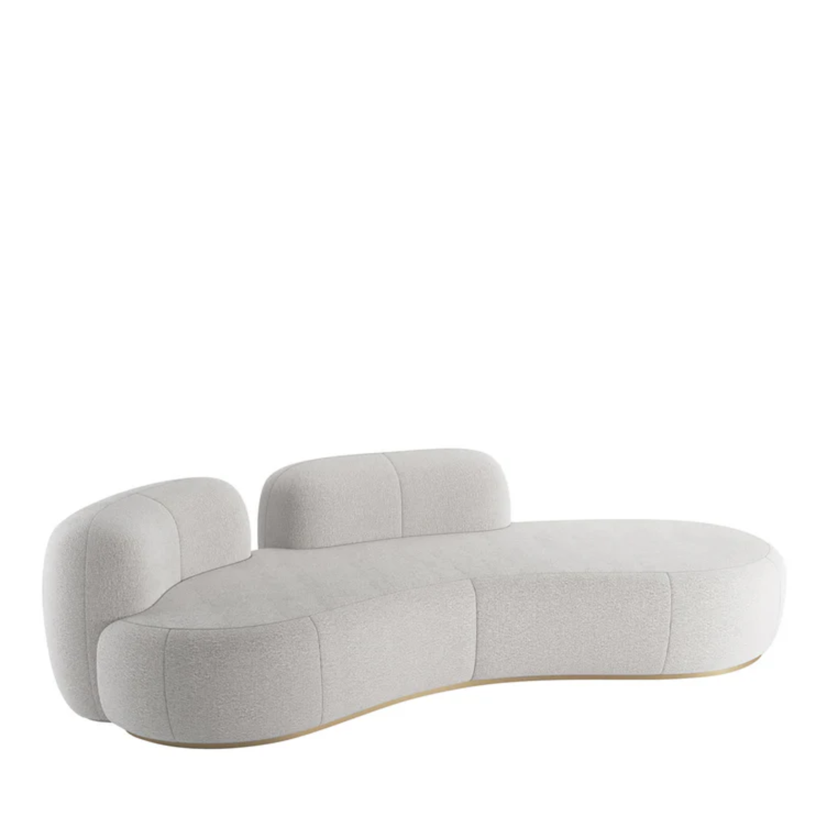 The Tateyama 2B XL Sofa by Artefatto is upholstered in Special Bouclé Pearl Bush with a Satin Brass metallic-effect base and it features low, modular backrests for a sleek, unobtrusive look. The sofa comes in six customizable configurations to fit any space.